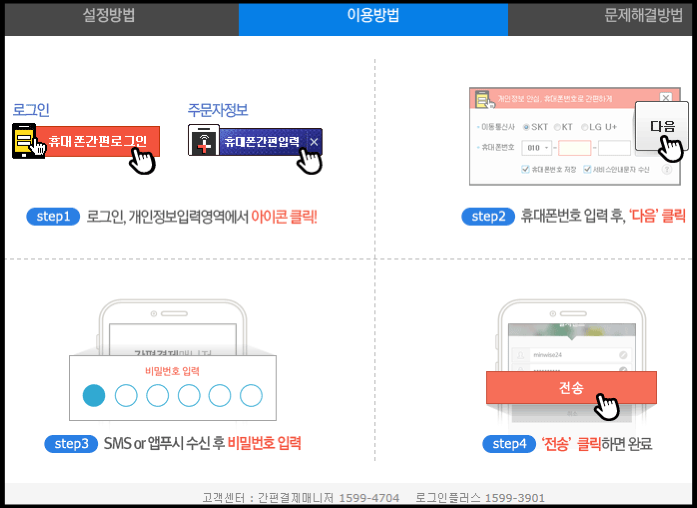 간편결제매니저 서비스를 PC에서 이용하려면 다음과 같은 설정을 해야 합니다. 휴대폰간편로그인 및 휴대폰간편입력을 모두 사용으로 설정하시면 됩니다.