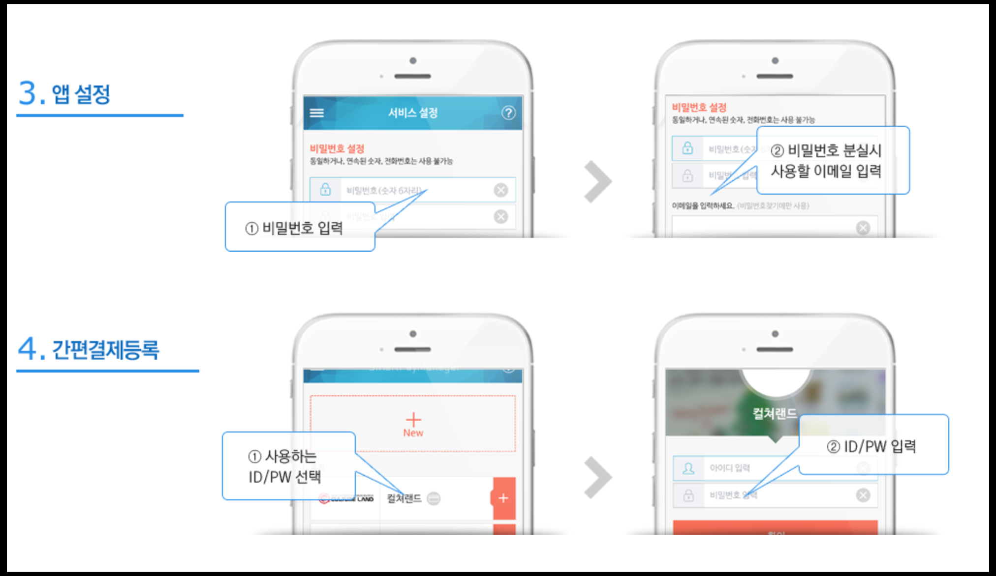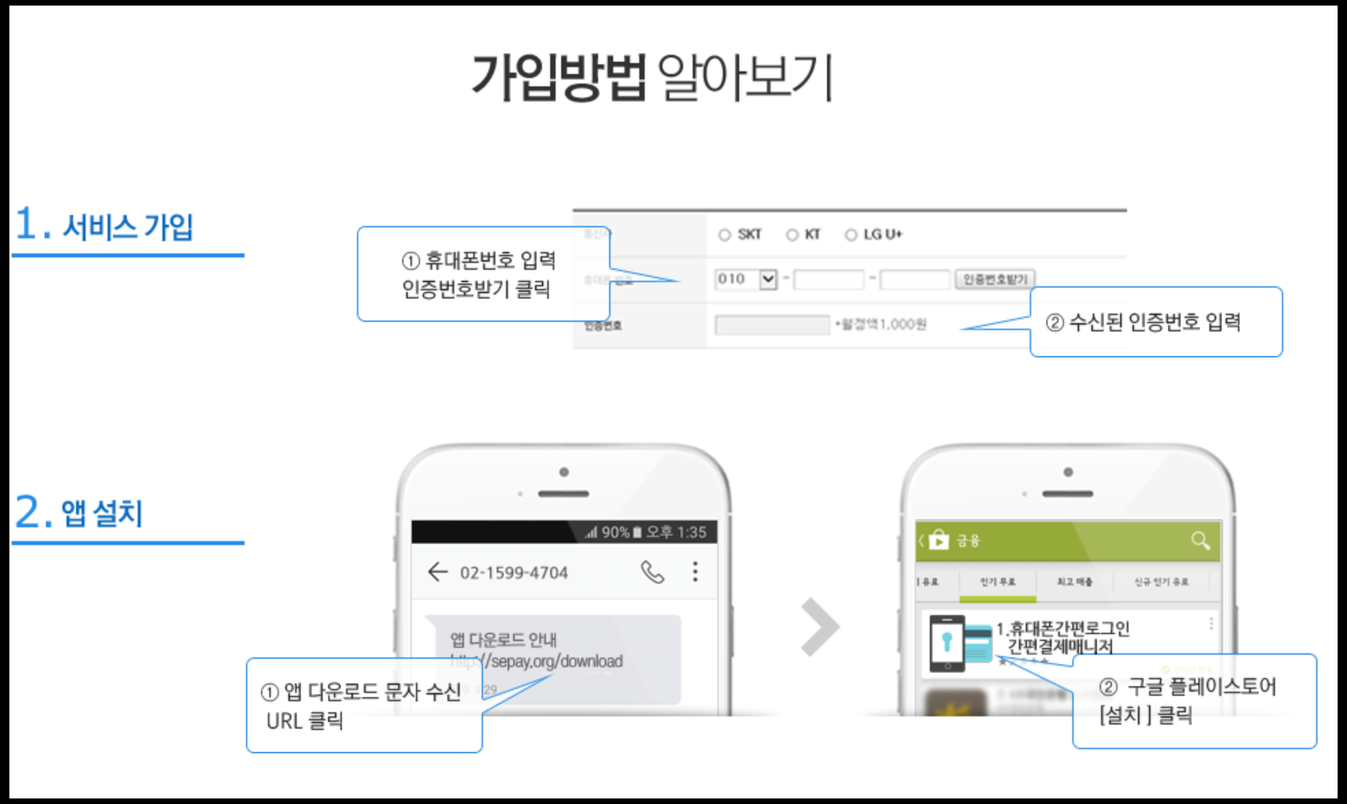 간편결제서비스/휴대폰간편로그인 가입 방법은 이렇습니다. '(1) 서비스 가입 (2) 앱 설치 (3) 앱 설정 (4) 간편결제등록' 과정으로 이루어집니다.