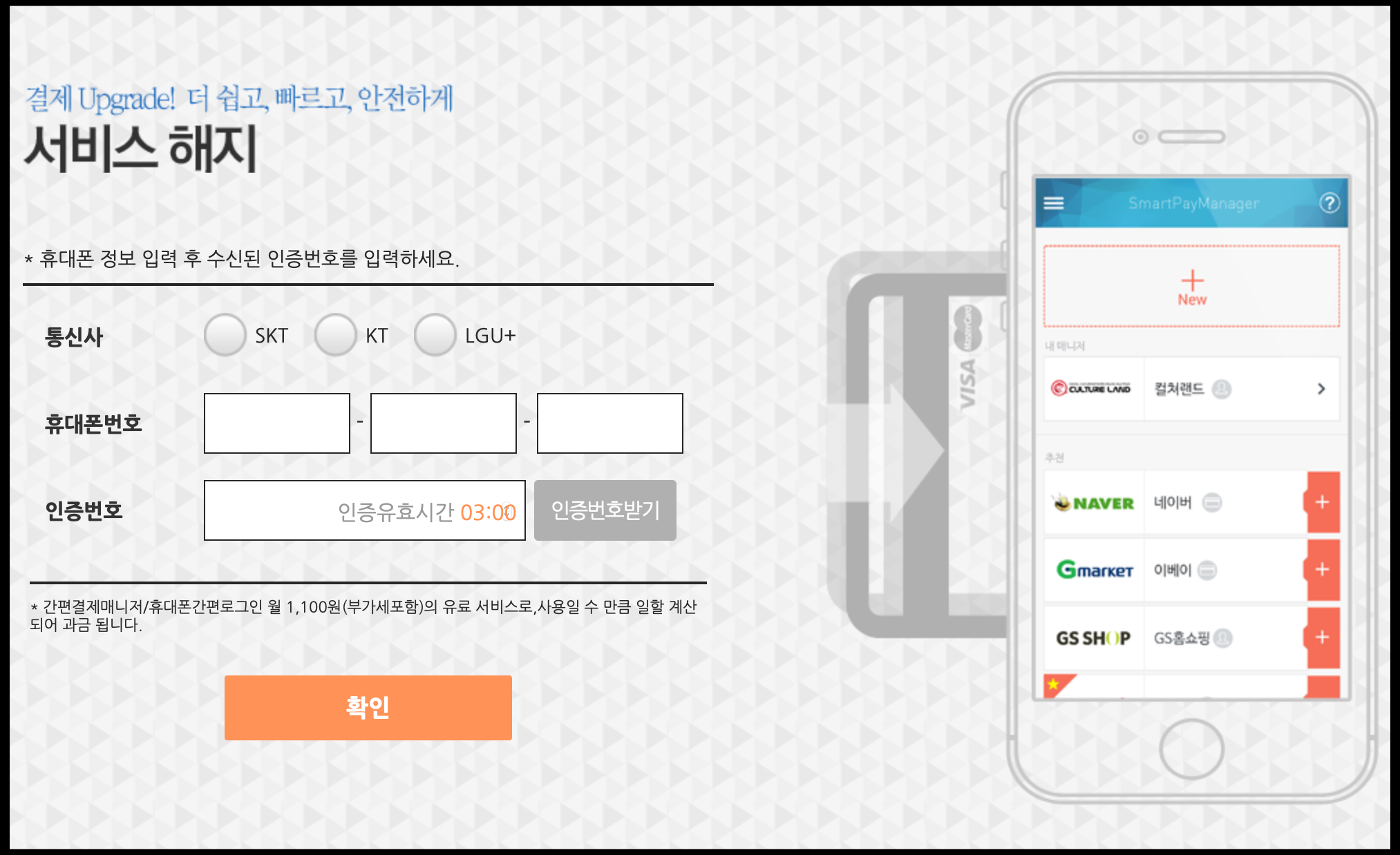 간편결제매니저 해지는 통신사, 휴대폰번호를 입력한 뒤 인증번호를 받으셔서 해지하시면 됩니다. 참고로 비밀번호 3회 실패 시 차단된다고 합니다. 서비스 해지는 홈페이지 뿐만 아니라 고객센터 1599-4704에서도 가능합니다.