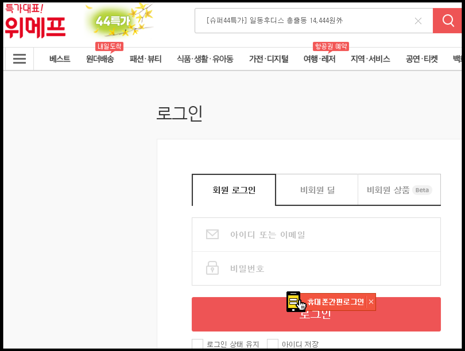 위메프 홈페이지에서 로그인을 시도했더니 '휴대폰간편로그인'이라는 아이콘이 뜹니다.