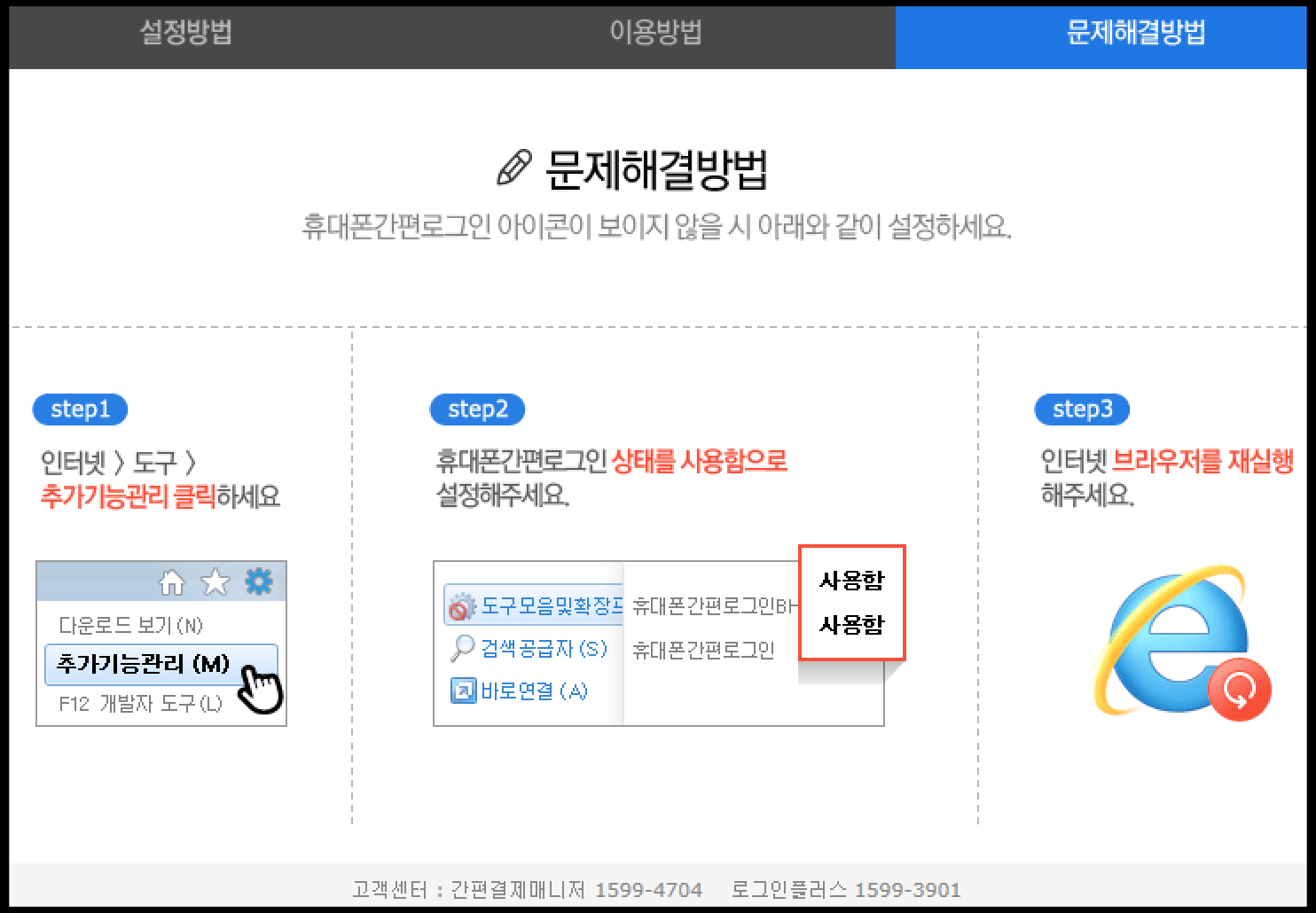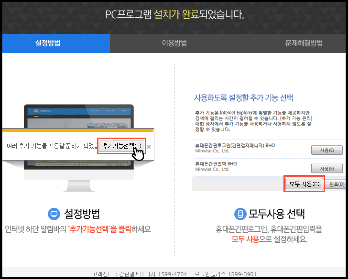 만약 PC에서 간편결제매니저 서비스가 원활하지 않을 경우 '인터넷>도구>추가기능관리' 순서로 클릭해서 휴대폰간편로그인 상태를 '사용함'으로 설정하시면 됩니다. 그 이후 인터넷 브라우저를 재실행하여 접속하시면 됩니다.