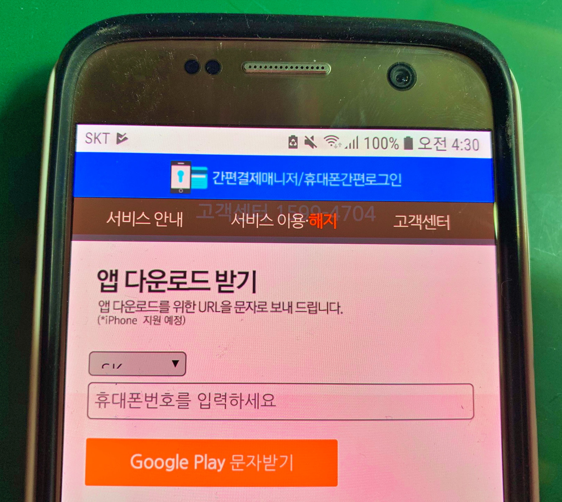 그 이후에는 간편결제서비스 앱을 설치해야 합니다. 해당 홈페이지 메인에 '앱 다운로드 받기'라는 메뉴가 있습니다. 이동통신사 선택 및 휴대폰번호를 입력하시면 됩니다.(아이폰 지원 예정) 그러면 문자를 통해 앱 설치에 대한 안내를 받습니다. 문자에 언급된 홈페이지에 접속하면 구글 플레이 스토어에 있는 '간편결제매니저 휴대폰간편로그인'((주)민앤지)라는 이름의 앱이 나옵니다. 그 앱을 설치하면 됩니다.