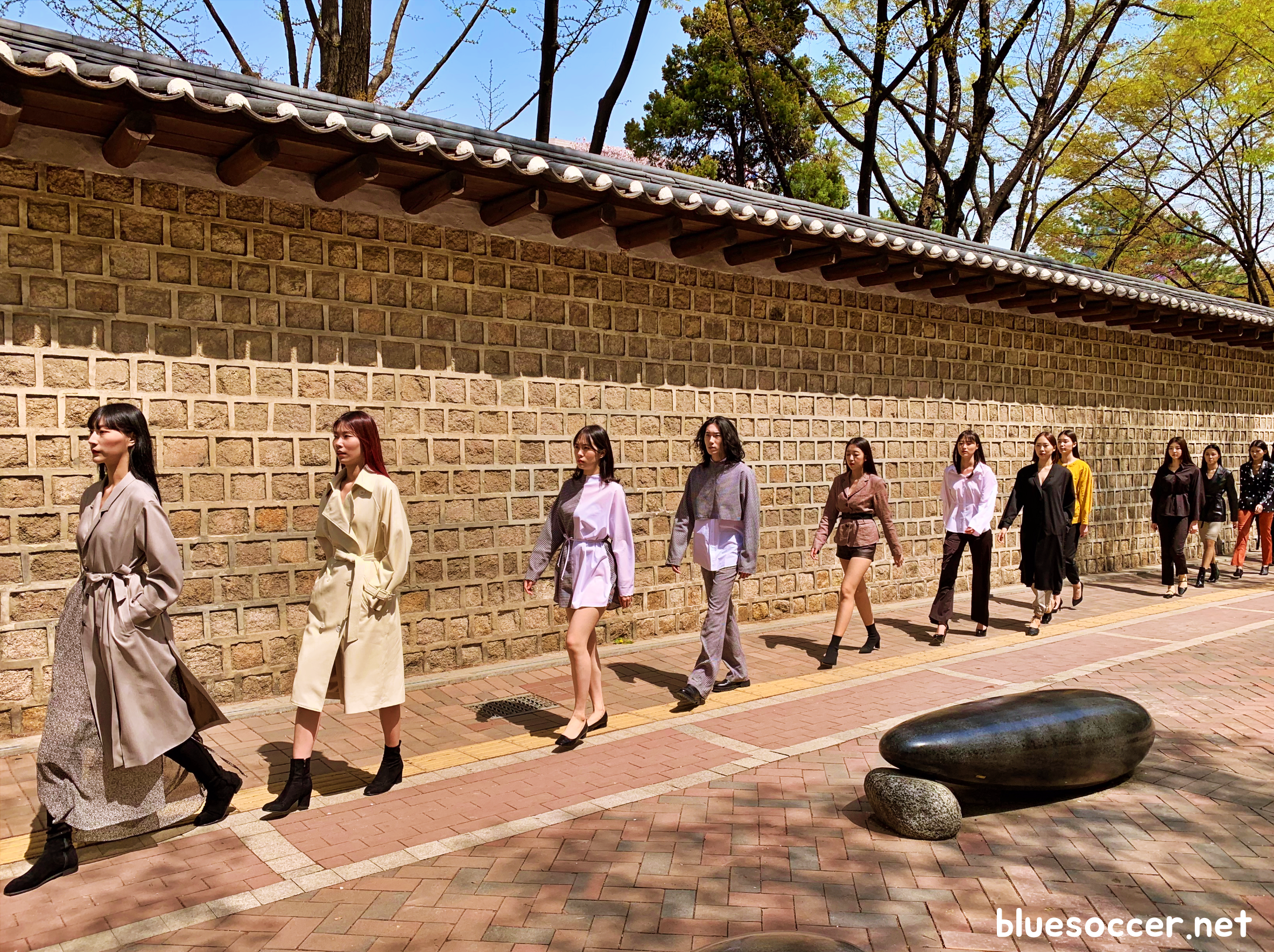 덕수궁 돌담길 앞에서 포즈를 취하는 모델들