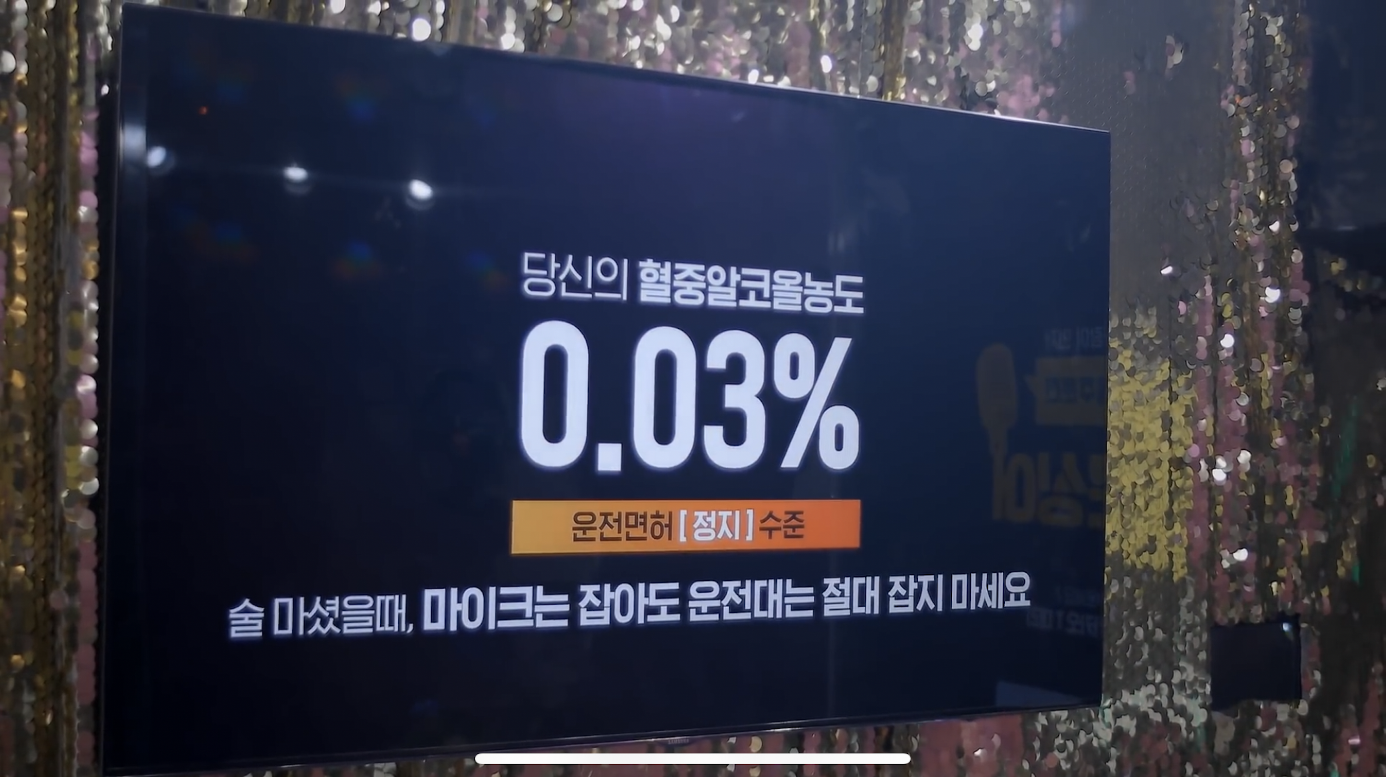 이렇게 혈중알코올농도가 뜹니다. 사진 속에서 혈중알코올농도 측정했던 사람의 경우 0.03%가 나왔습니다. 모니터에 운전면허 정지 수준이라고 뜨면서 음주운전의 경각심을 불어 넣습니다. 드렁큰싱어는 노래와 음주운전 측정을 접목시켰다는 점에서 실생활에 맞는 이벤트를 진행했습니다. 특히 한국의 성인들은 사람들과 함께 술을 마신 뒤 노래방에서 함께 노래를 부르는 것을 좋아합니다. 하지만 노래방에서 시간을 보낸 뒤 집으로 귀가하는 과정에서 누군가는 대리운전을 부르지 않고 직접 차량을 몰며 음주운전을 합니다. 이러한 일은 더 이상 없어야 합니다.