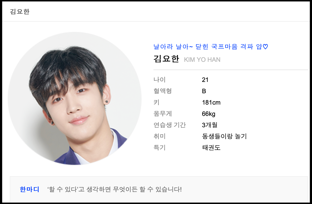 프로듀스 X 김요한 나이 및 지난 1회 활약상에 대한 사람들의 관심이 커지는 중입니다. 연습생 기간이 3개월로서 짧음에도 불구하고 프로듀스 X 101 1회부터 국민 프로듀서들에게 강렬한 첫인상을 심어줬습니다. 여기에 김요한 태권도 선수 출신(선출) 및 잘생긴 외모, 프로듀스 X 101 1주차 순위 3위라는 점에서 프로듀스 X 101 김요한 나이 및 1회 활약 등이 국민 프로듀서들에게 상당한 주목을 받고 있습니다. 아직은 김요한 데뷔 여부를 장담할 수 없으나 첫인상부터 상당히 마음에 드는 인물임에는 분명했습니다.
