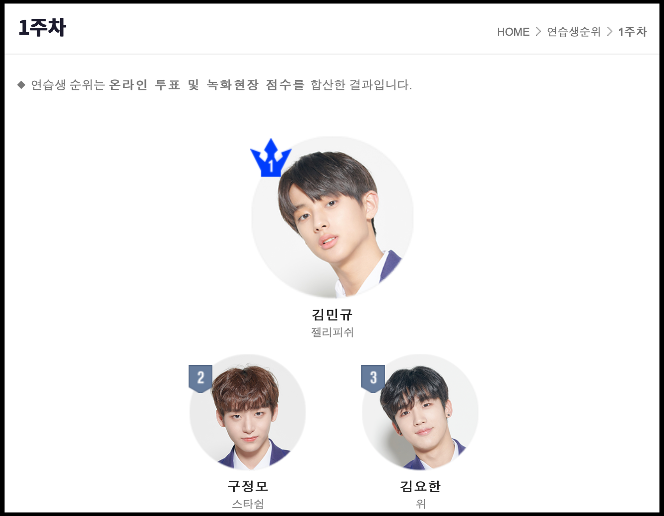 [사진 = Mnet 프로듀스 X 101 1주차 1~3위 이렇습니다. 각각 김민규(젤리피쉬) 구정모(스타쉽) 김요한(위)이 TOP3에 올랐습니다. 3명 모두 프로그램 방영 이전부터 국민 프로듀서들의 주목을 받았던 인물들입니다. 아직은 누구도 데뷔를 장담할 수 없으나 방영 초반부터 높은 순위에 올랐다는 것은 다른 연습생들에 비해서 국민 프로듀서들의 관심을 빠르게 사로잡았다고 볼 수 있습니다. (C) Mnet 프로듀스 X 101 공식 홈페이지(produce-x-101.mnet.com)]