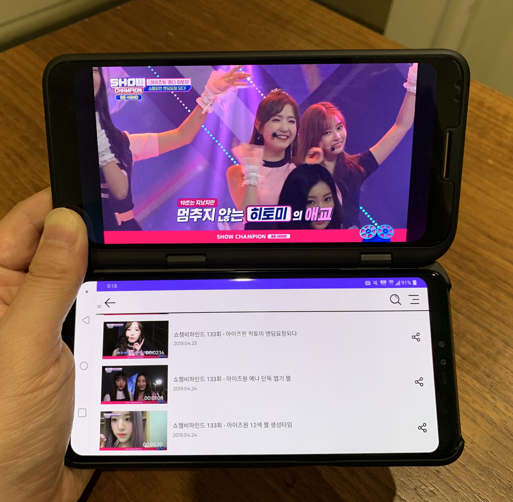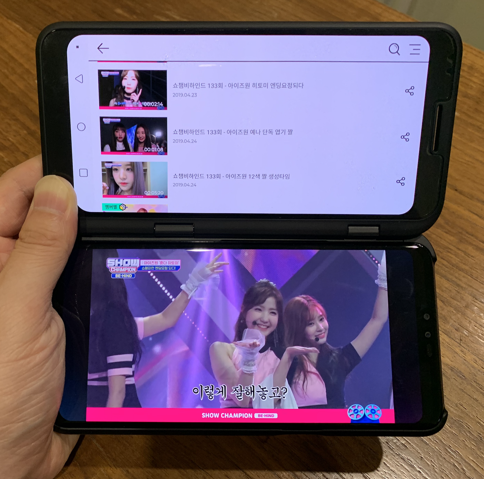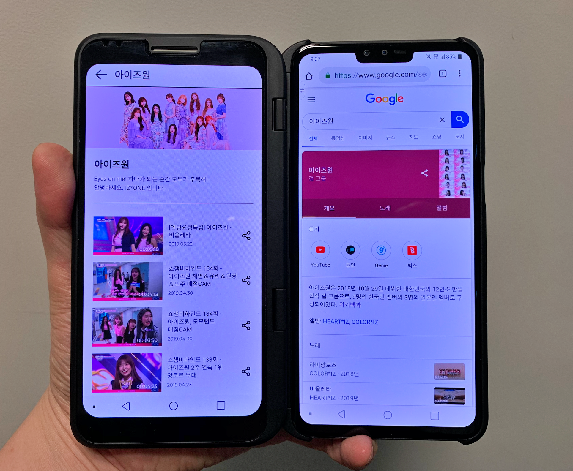 LG V50 ThinQ의 스크린 왼쪽은 LG U+ 아이돌 Live 앱을 실행한 모습, 스크린 오른쪽은 인터넷 검색 실행 모습입니다. LG V50 ThinQ로 2개의 앱을 동시에 실행할 수 있는 것은 이미 온라인에서 많이 알려졌습니다. 스크린 왼쪽과 오른쪽의 공통점이 있습니다. 그것은 바로 걸그룹 아이즈원입니다. LG U+ 아이돌 Live 앱에서 아이즈원 영상을 둘러보면서 인터넷으로 아이즈원을 검색하는 모습을 저의 사진을 통해 접할 수 있습니다. 참고로 LG U+ 아이돌 Live 앱은 LG 유플러스 뿐만 아니라 다른 이동통신사 이용자도 쓸 수 있습니다. 그 점이 정말 좋더군요.