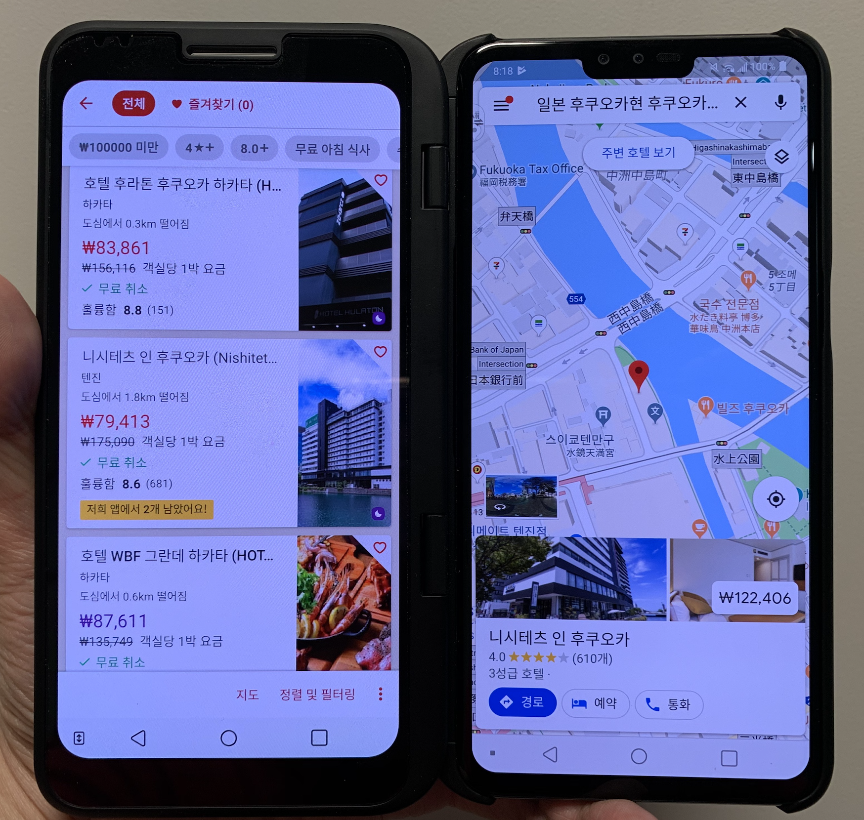 해외여행 시 숙박할 호텔을 찾는데 있어서 LG V50 ThinQ가 도움이 될 수 있습니다. 호텔 앱, 구글 지도 앱(또는 포털 검색)을 동시에 활용할 수 있으니 말입니다. 호텔 숙박 가격대 및 후기를 보면서 그 호텔이 어디에 위치했는지, 또는 블로그에 뜨는 자세한 후기를 읽을 수 있습니다.