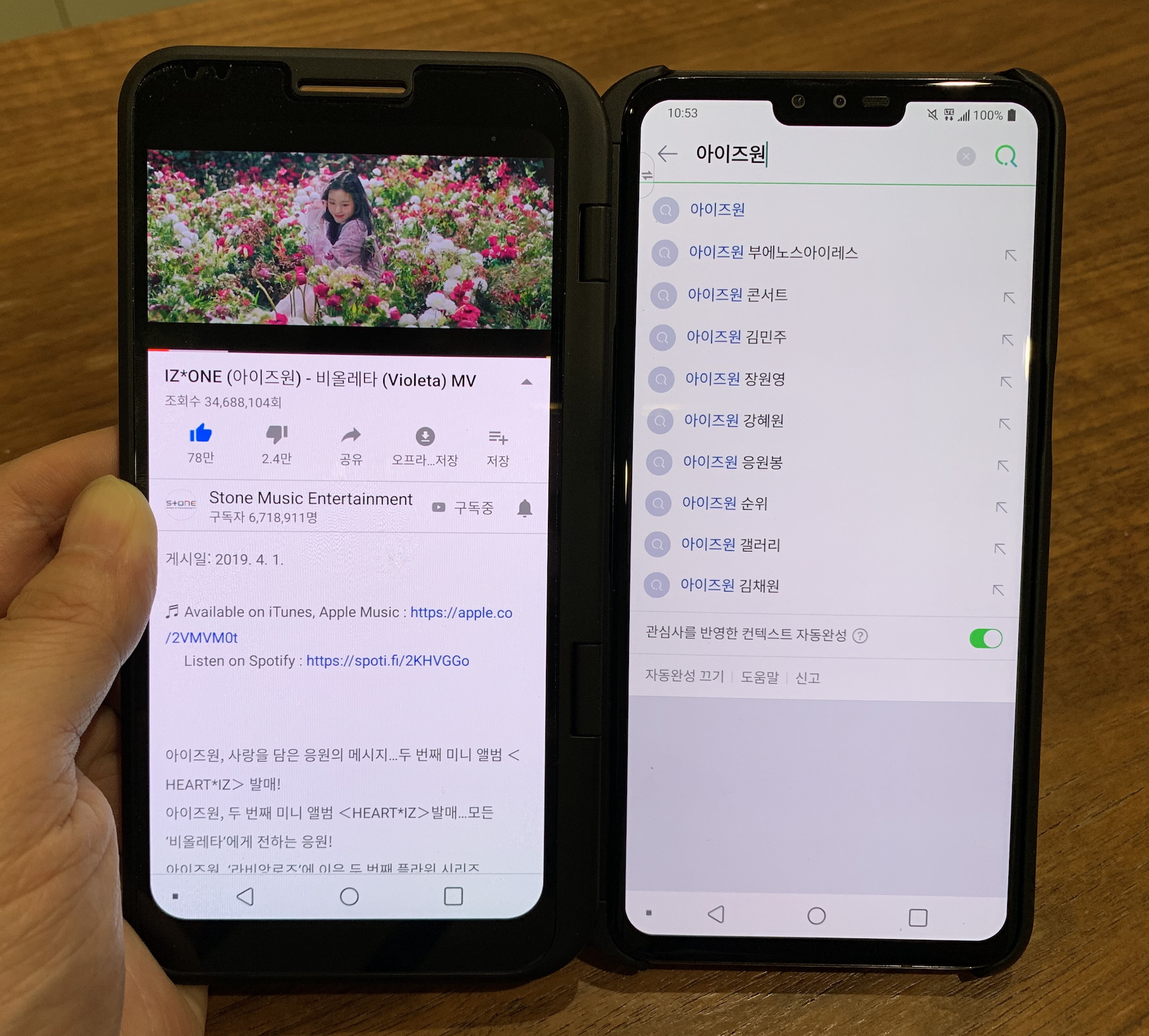 LG V50 ThinQ로 아이즈원 영상은 날마다 시청합니다. 유튜브에 뜬 아이즈원 뮤직비디오를 보면서 때로는 포털에 올라오는 아이즈원 관련 정보를 검색합니다. 아이즈원 팬이다 보니 아이즈원과 관련된 이슈에 주목할 수 밖에 없으니까요.