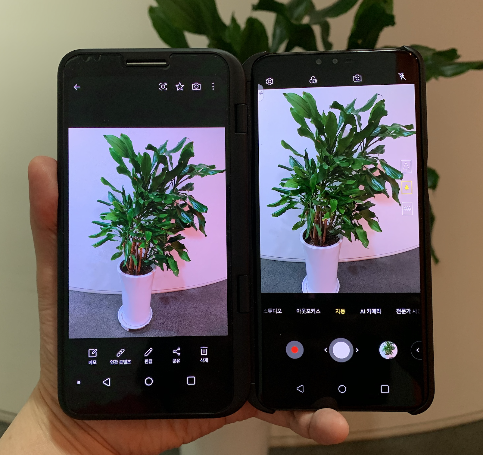 LG V50 ThinQ 듀얼 스크린은 카메라 촬영 시에도 유용합니다. 무언가의 사진을 촬영 완료하면 왼쪽 스크린으로 그 결과물이 바로 뜹니다. 만약 촬영 결과물이 마음에 들지 않는다면 오른쪽 스크린을 바라보며 사진 촬영을 다시 할 수 있습니다.