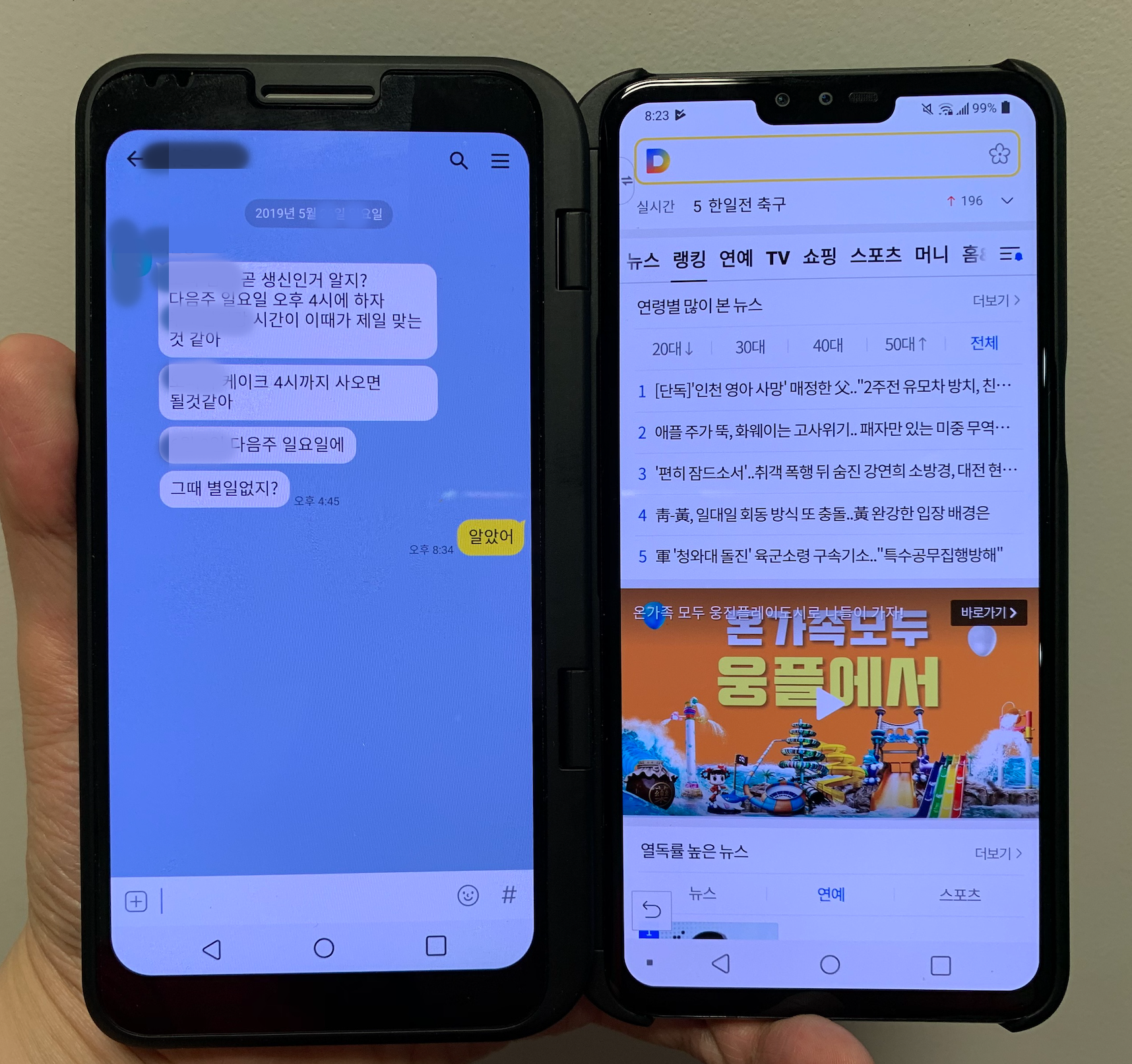 카톡과 인터넷 포털 뉴스 읽기도 함께할 수 있습니다. 듀얼 스크린으로 2개의 일을 한꺼번에 할 수 있어서 편합니다.