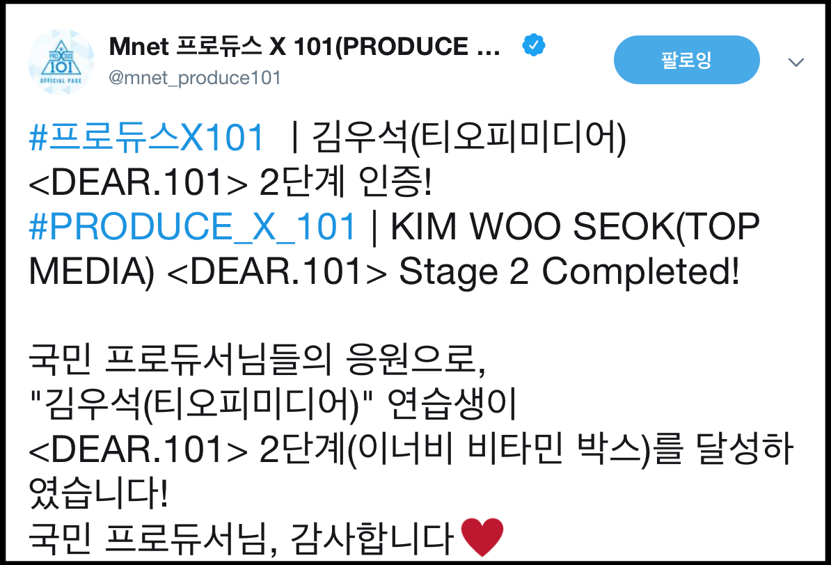 [사진 = 김우석이 최근 프로듀스 X 101 DEAR.101 2단계를 달성했습니다. DEAR.101은 국민 프로듀서가 참여하는 후원 형태로서 단계가 높은 연습생일수록 코어팬층이 얼마나 높은지 조금 짐작갑니다. 김우석 포함한 다른 연습생들도 2단계를 달성했습니다. (C) Mnet 프로듀스 X 101 공식 트위터]