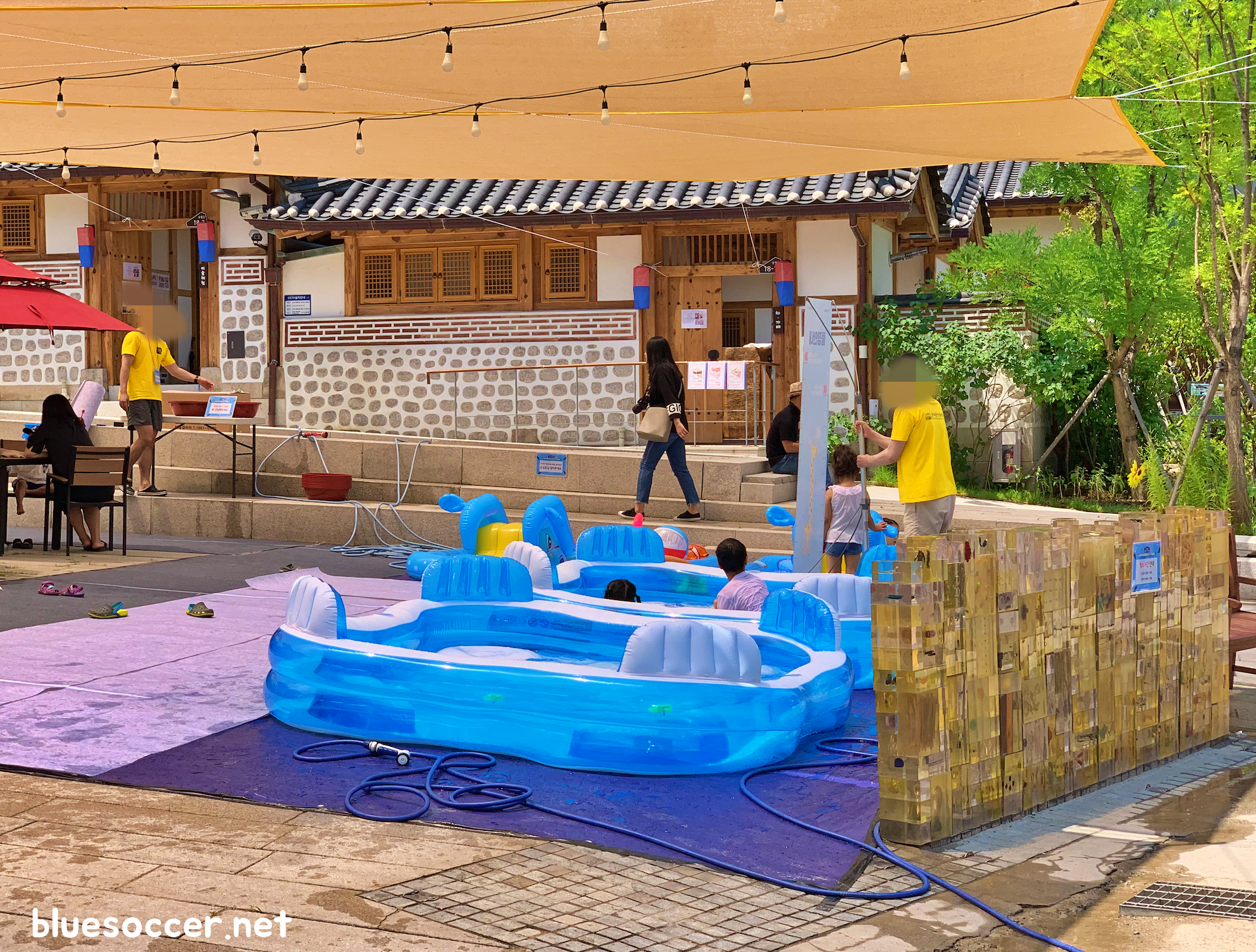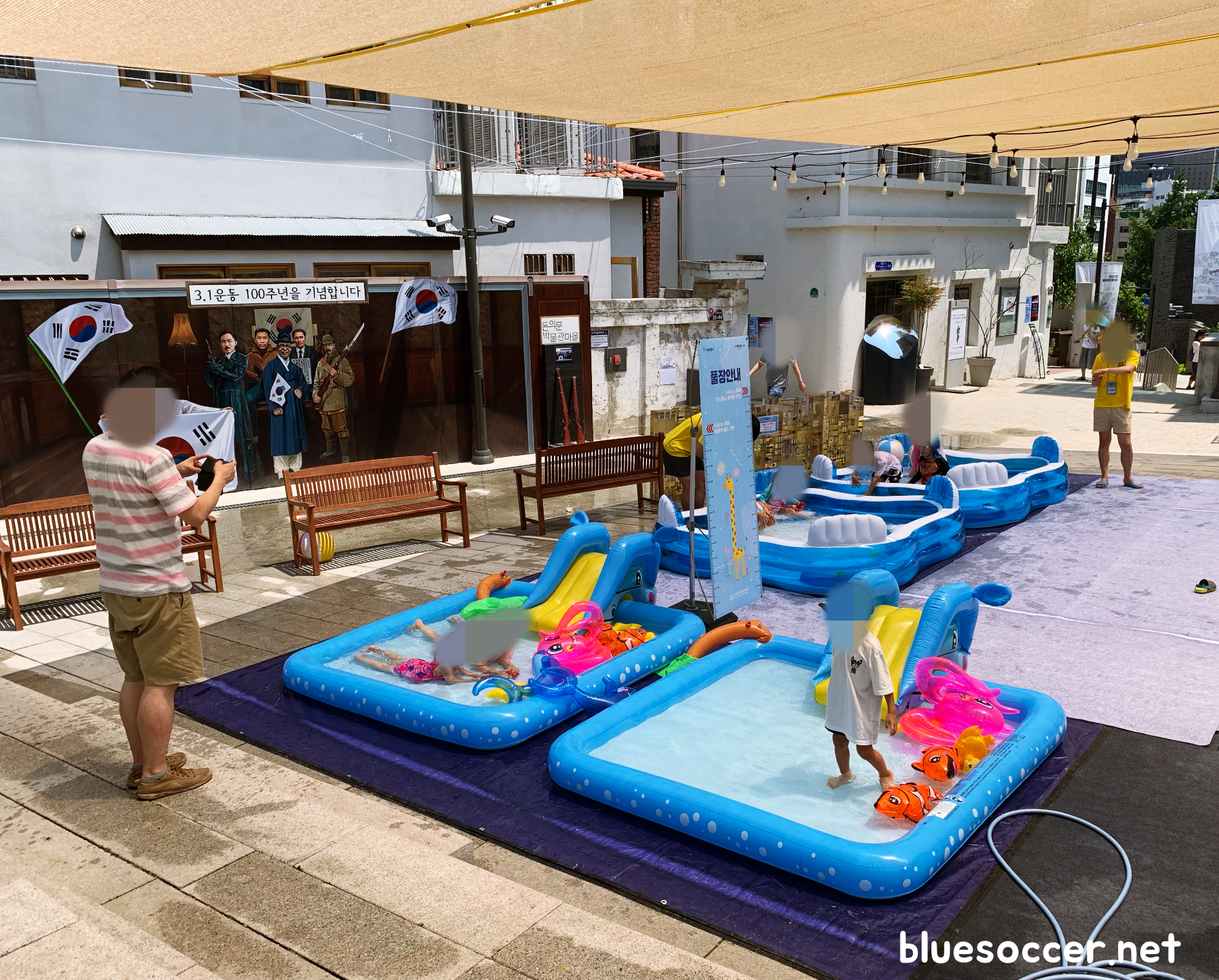돈의문박물관마을의 마을마당에는 풀장이 큼지막하게 펼쳐졌습니다. 이곳에서 어린이들이 물놀이 즐기는 모습을 봤습니다.