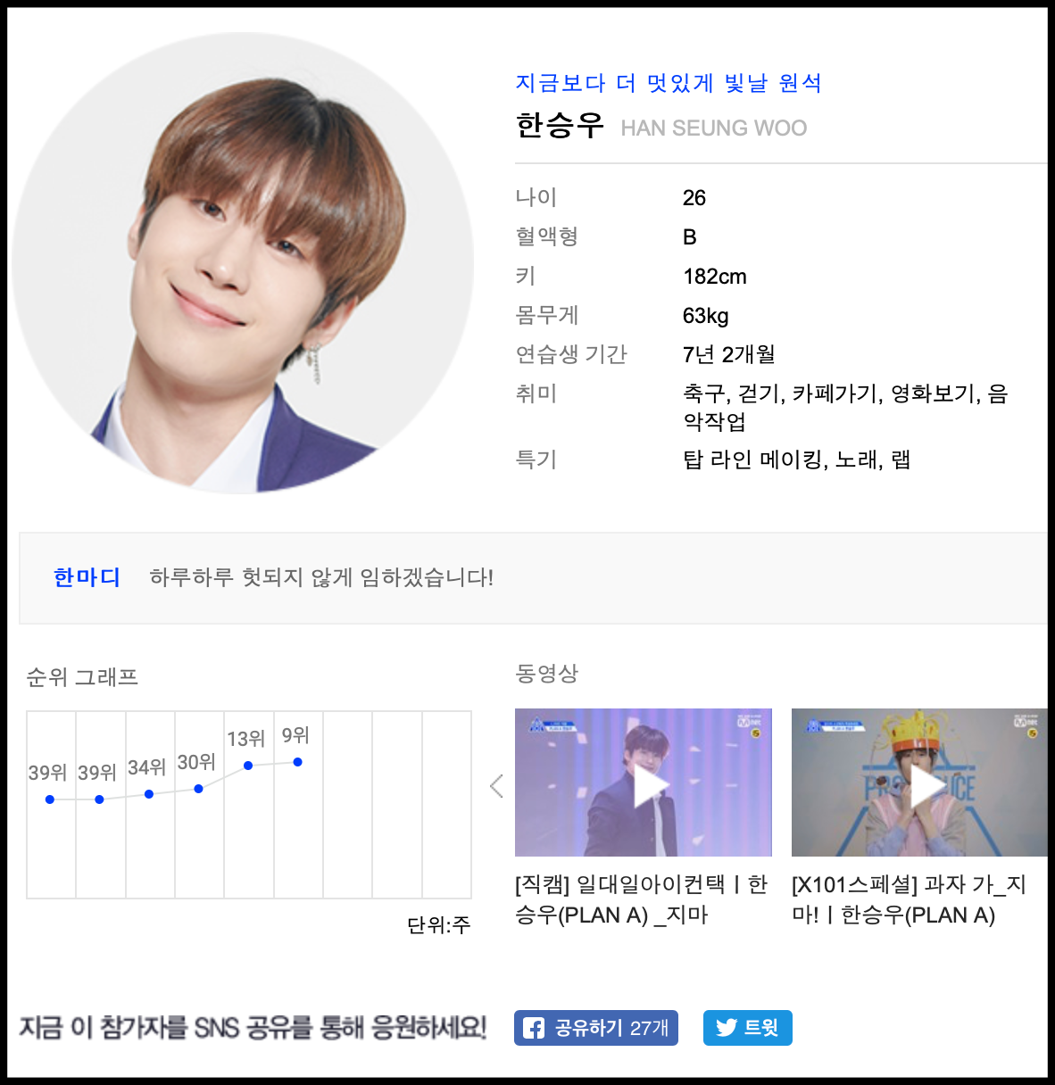 어쨌거나 프로듀스 X 101을 통해 데뷔할 팀에 한승우 포함된다면 그 팀의 고음 파트는 걱정하지 않아도 될 듯 합니다. 고음 파트 뿐만이 아닙니다. 실력파 메인보컬이 있는 것은 팀의 음악적 퀄리티에 있어서 플러스가 됩니다. 한승우가 꼭 데뷔하는 모습을 보고 싶습니다.