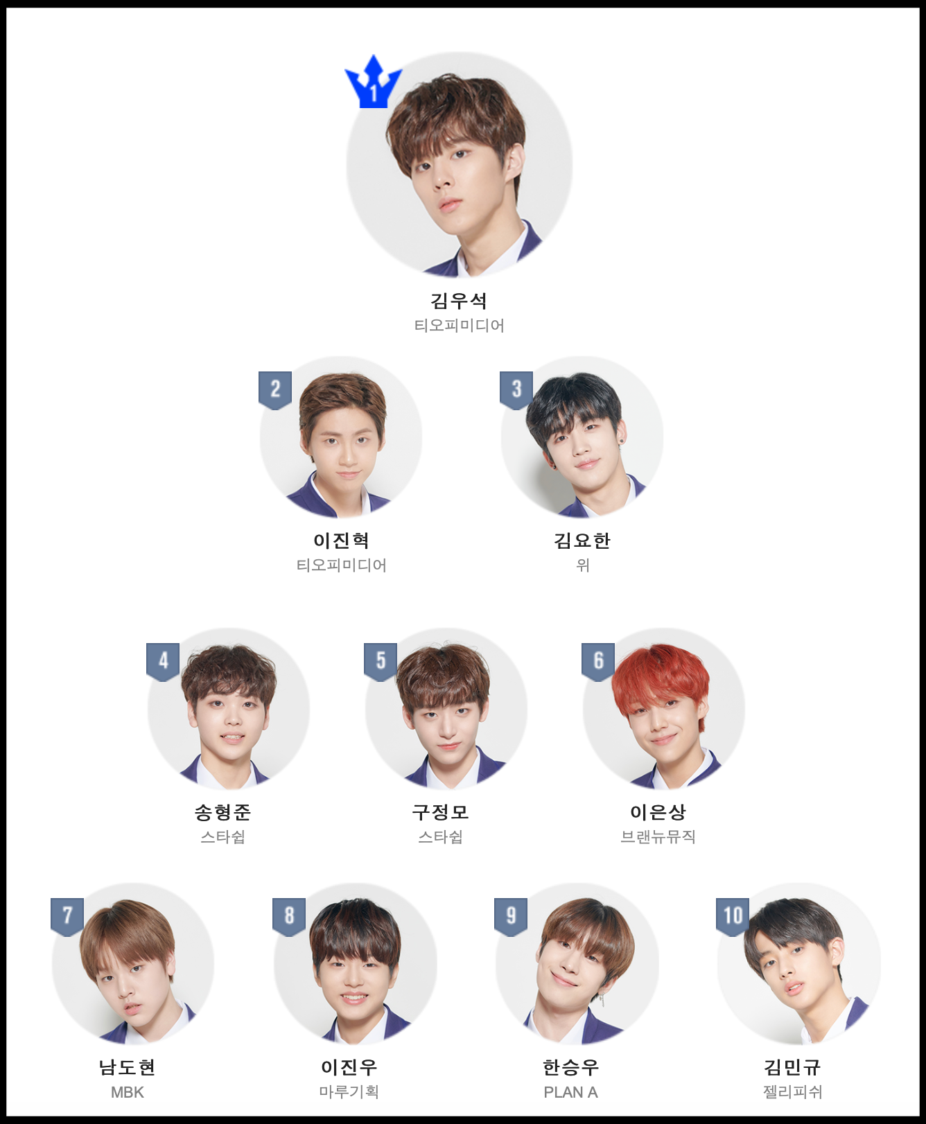 [사진 = 프로듀스 X 101 2차 순위 발표식(8주차) 순위입니다. 한승우가 처음으로 데뷔권에 진입했습니다. 김우석, 이진우 1~2위 진입을 놓고 보면 현역 아이돌+실력파 아이돌의 강세가 데뷔조에서 눈에 띄었습니다. (C) Mnet 프로듀스 X 101 공식 홈페이지]