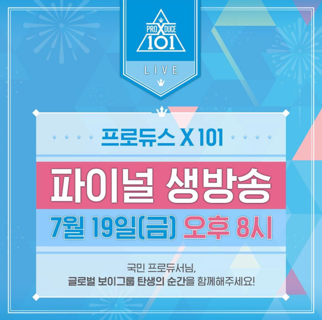 [사진 = 프로듀스 X 101 파이널 생방송이 7월 19일 저녁 8시 Mnet에서 방영됩니다. 파이널 생방송에서는 마지막 경연인 To My World, 소년미를 선보일 예정입니다. 그와 더불어 역대 프로듀스 시즌처럼 발라드 노래까지 나올 것으로 보입니다. 과연 프로듀스 X 101을 통해서 데뷔할 10명+X는 누구일지 국민 프로듀서들의 관심이 점점 고조될 것입니다. (C) Mnet 프로듀스 X 101 공식 인스타그램]