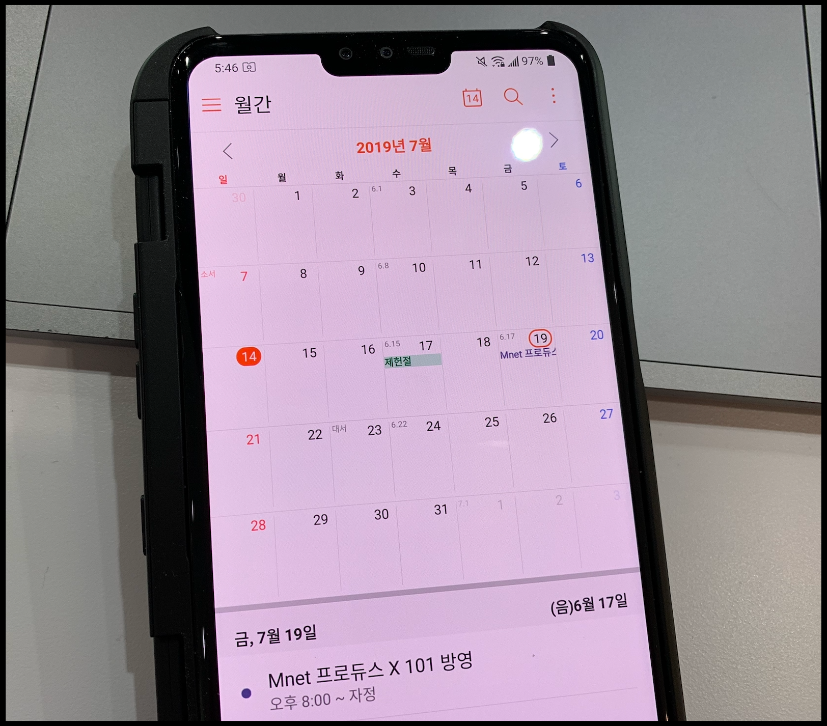 [사진 = 2019년 7월 19일 Mnet 프로듀스 X 101 12회 방영됩니다. 사진은 저의 스마트폰 달력이며 2019년 7월 19일을 가리킵니다. (C) 나이스블루]