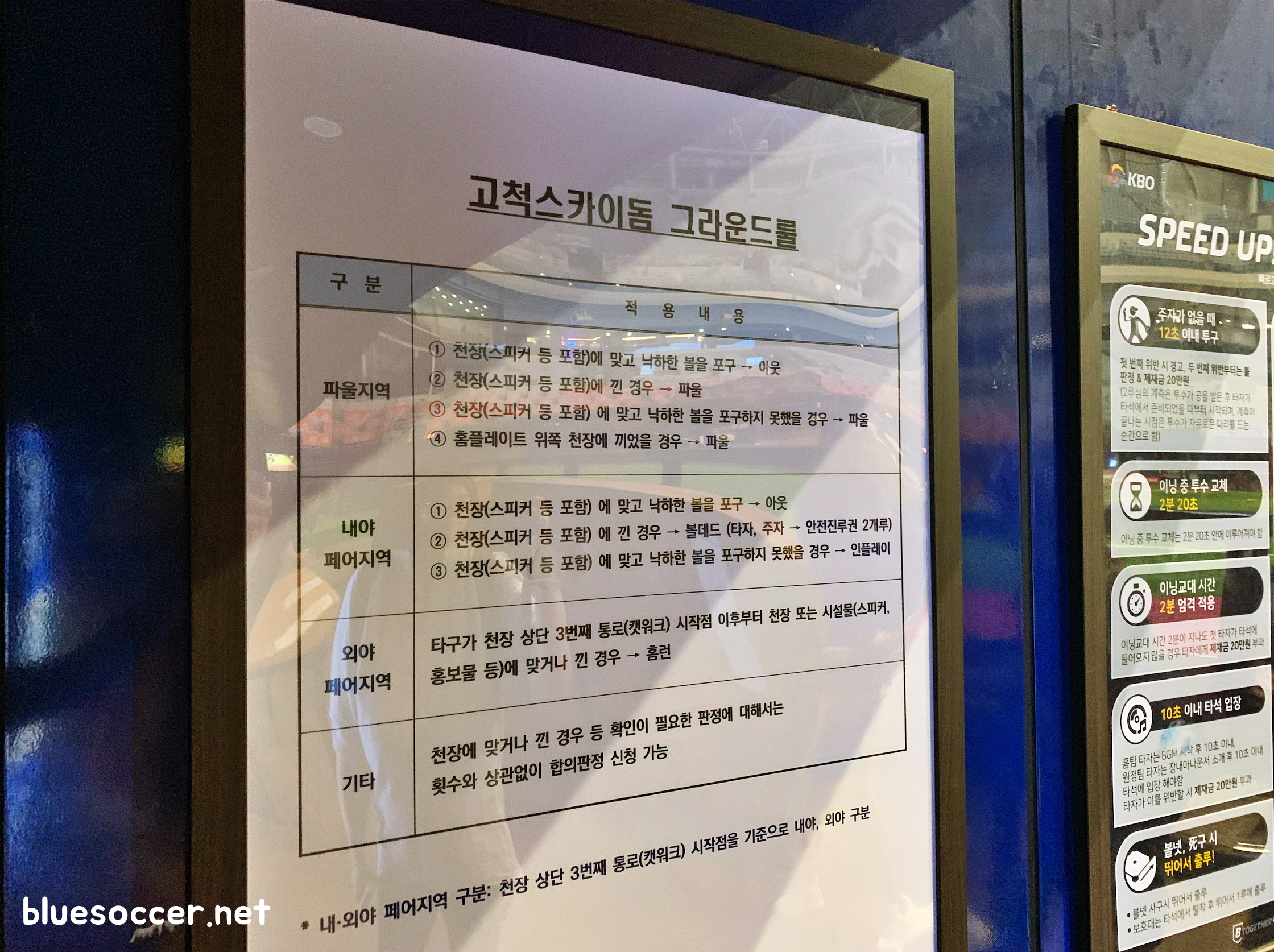 고척스카이돔 그라운드룰 존재하는 것을 알게 됐습니다. 파울볼이 천장을 맞는 등 여러 상황에 대한 판정이 정해졌습니다. 일본 도쿄돔도 그라운드룰이 따로 존재하는 것처럼 고척스카이돔도 마찬가지입니다.