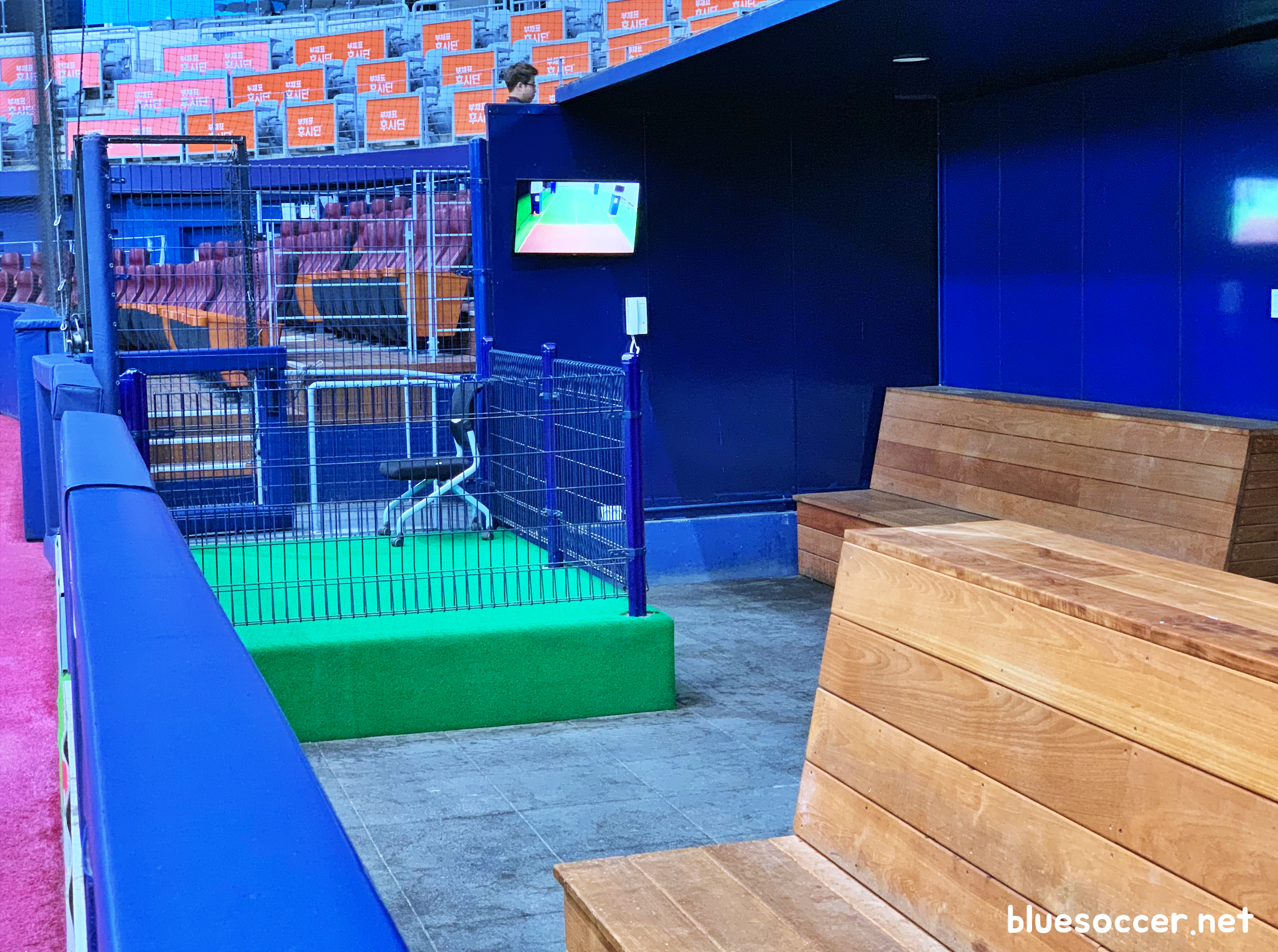 이곳은 3루 원정 팀 벤치입니다. 감독과 가까운 곳은 불펜을 바라볼 수 있는 모니터가 있습니다. 불펜에 대해서는 뒤에서 설명하겠습니다.