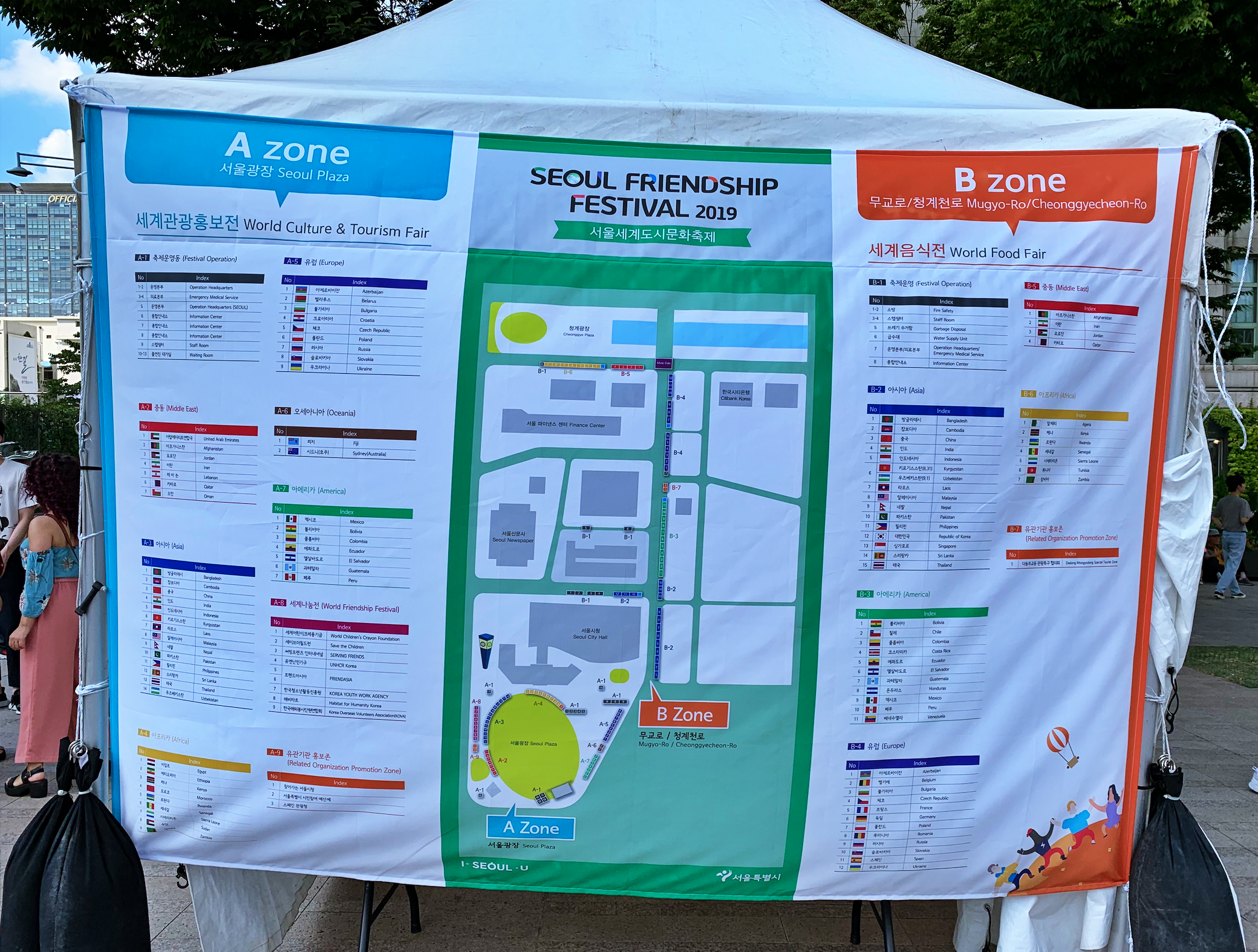 서울세계도시문화축제는 A zone에서 세계관광홍보전, B zone에서 세계음식전이 펼쳐졌습니다. 관광홍보 및 음식의 콘텐츠가 서로 다르기에 행사 구역이 따로 나누어졌습니다. A zone에서는 세계관광홍보전 뿐만 아니라 세계나눔전이 펼쳐졌습니다.