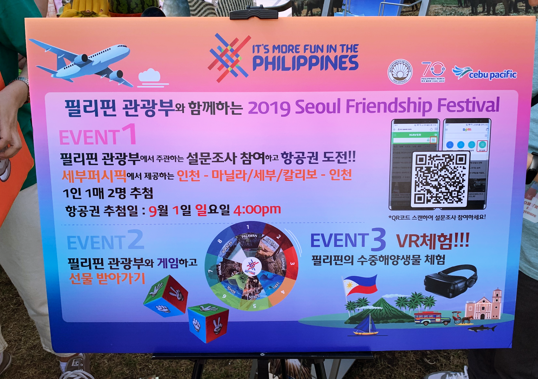 필리핀 부스에서는 필리핀 관광부와 함께하는 이벤트를 마련했습니다. 세부퍼시픽에서 제공하는 항공권을 받는 이벤트 뿐만 아니라 게임 및 VR체험이 펼쳐졌습니다. 필리핀 부스에서 서울세계도시문화축제를 상당히 신경쓰고 있다는 인상을 받았습니다. 이벤트 홍보 자료가 한글로 제작된 것을 보면, 최근 한국에서 동남아 여행객 수요가 늘어나는 흐름을 잘 파악한 것 같습니다.