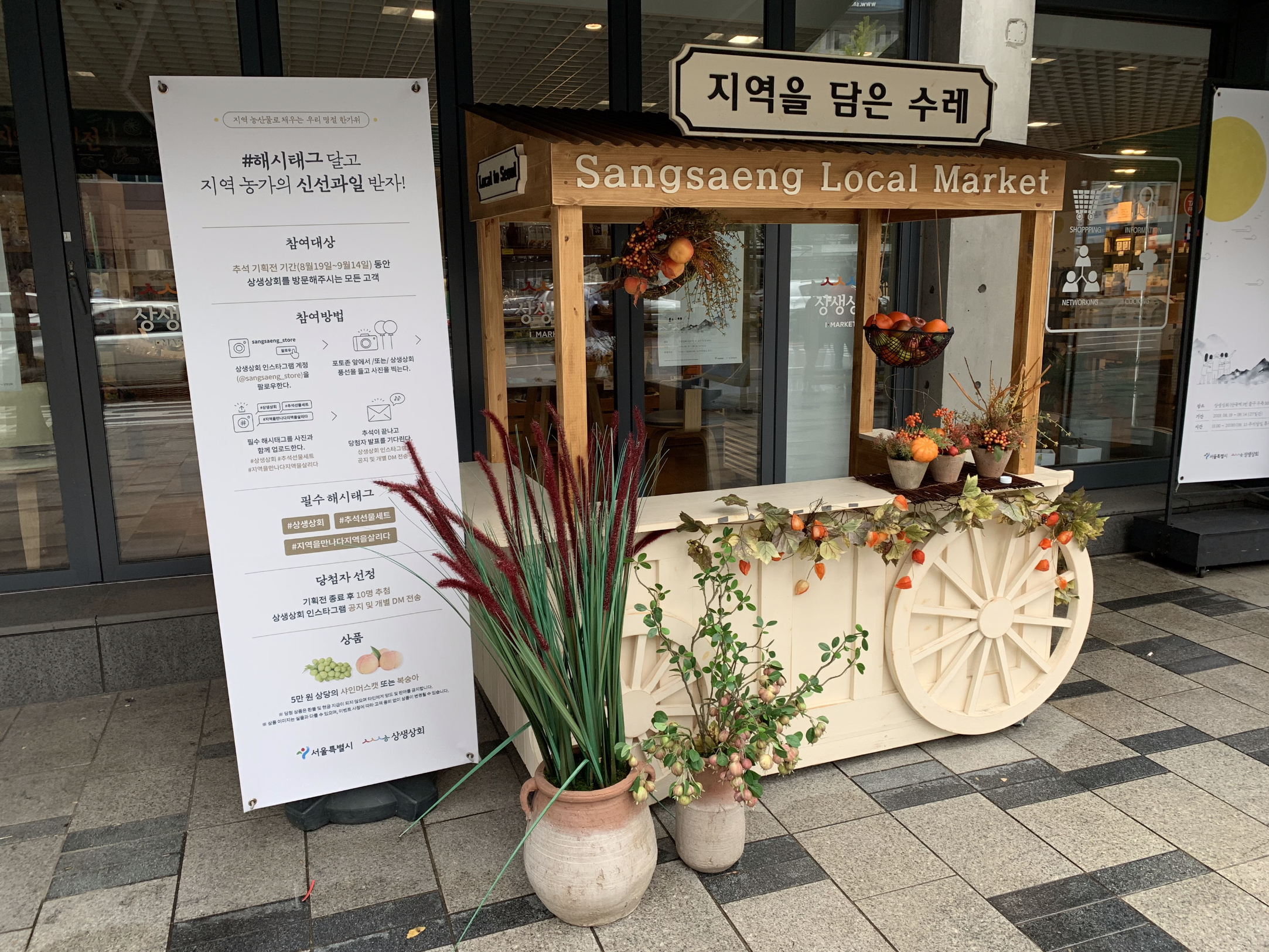 상생상회 매장 앞에는 '#해시태그 달고 지역 농가의 신선과일 받자!'는 이벤트를 알리는 홍보물이 놓여 있습니다. 현재 상생상회에서는 추석 연휴를 맞이하여 추석 기획전(2019년 8월 19일~2019년 9월 14일, 9월 13일 추석 다일 휴무)이 펼쳐지는 중입니다. 이곳을 찾는 모든 고객을 대상으로 하는 인스타그램 이벤트가 진행중입니다. 기획전이 끝나면 10명 추첨해서 5만 원 상당의 사인머스캣 또는 복숭아 증정 예정입니다. 이러한 이벤트를 통해 상생상회가 사람들에게 더욱 알려지는 것 같습니다.
