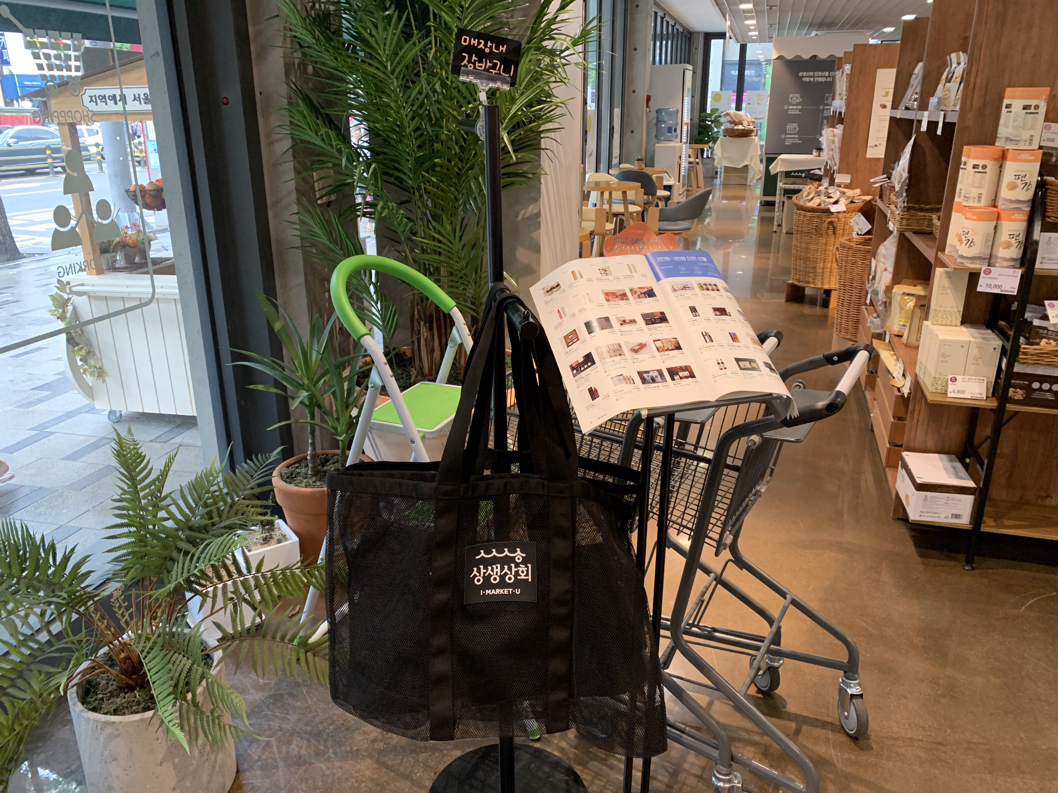 매장 내에서 쓸 수 있는 장바구니는 상생상회 글씨가 눈에 띄게 표기됐습니다. 시각적으로 봐도 장바구니가 잘 만들어졌습니다.