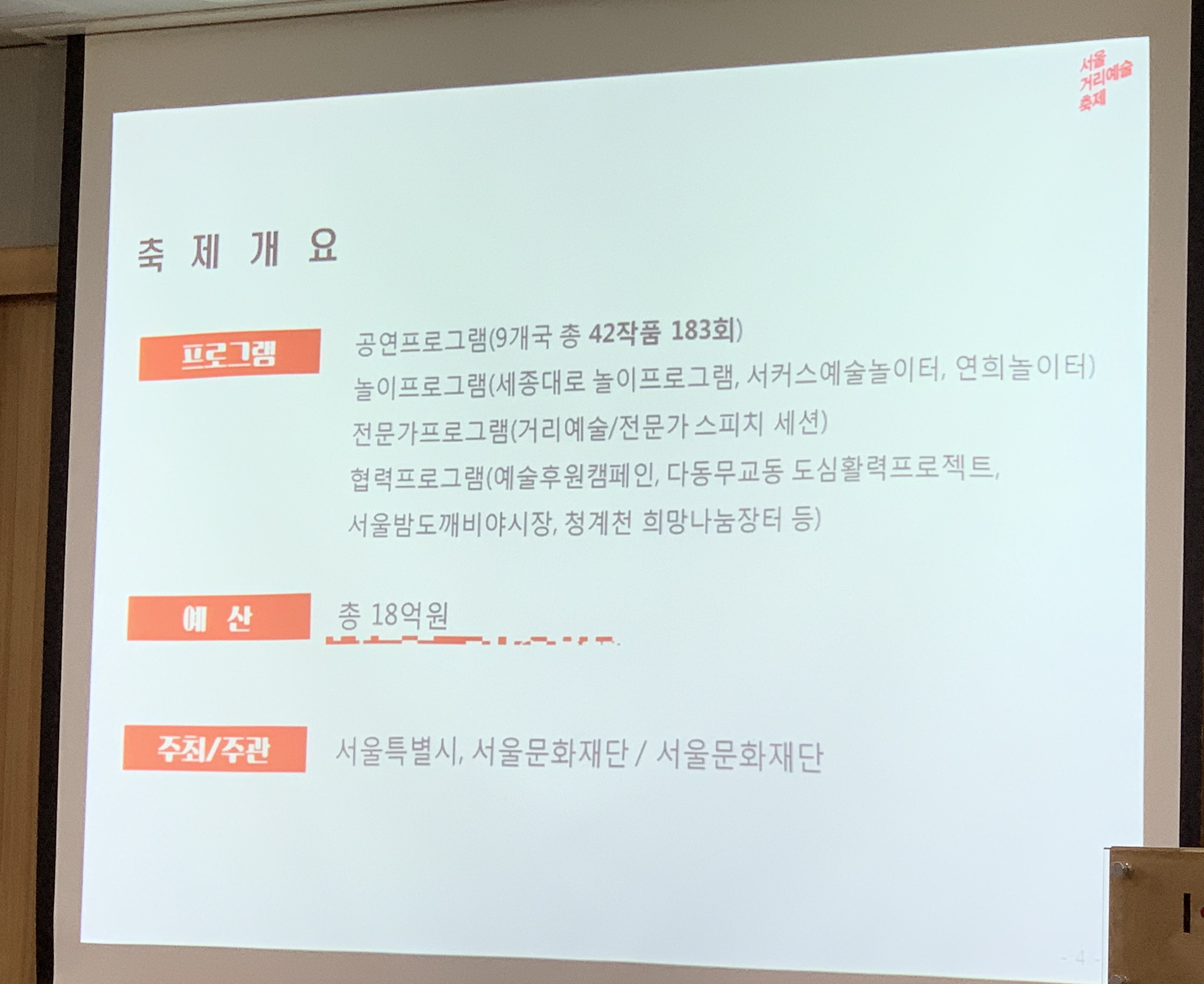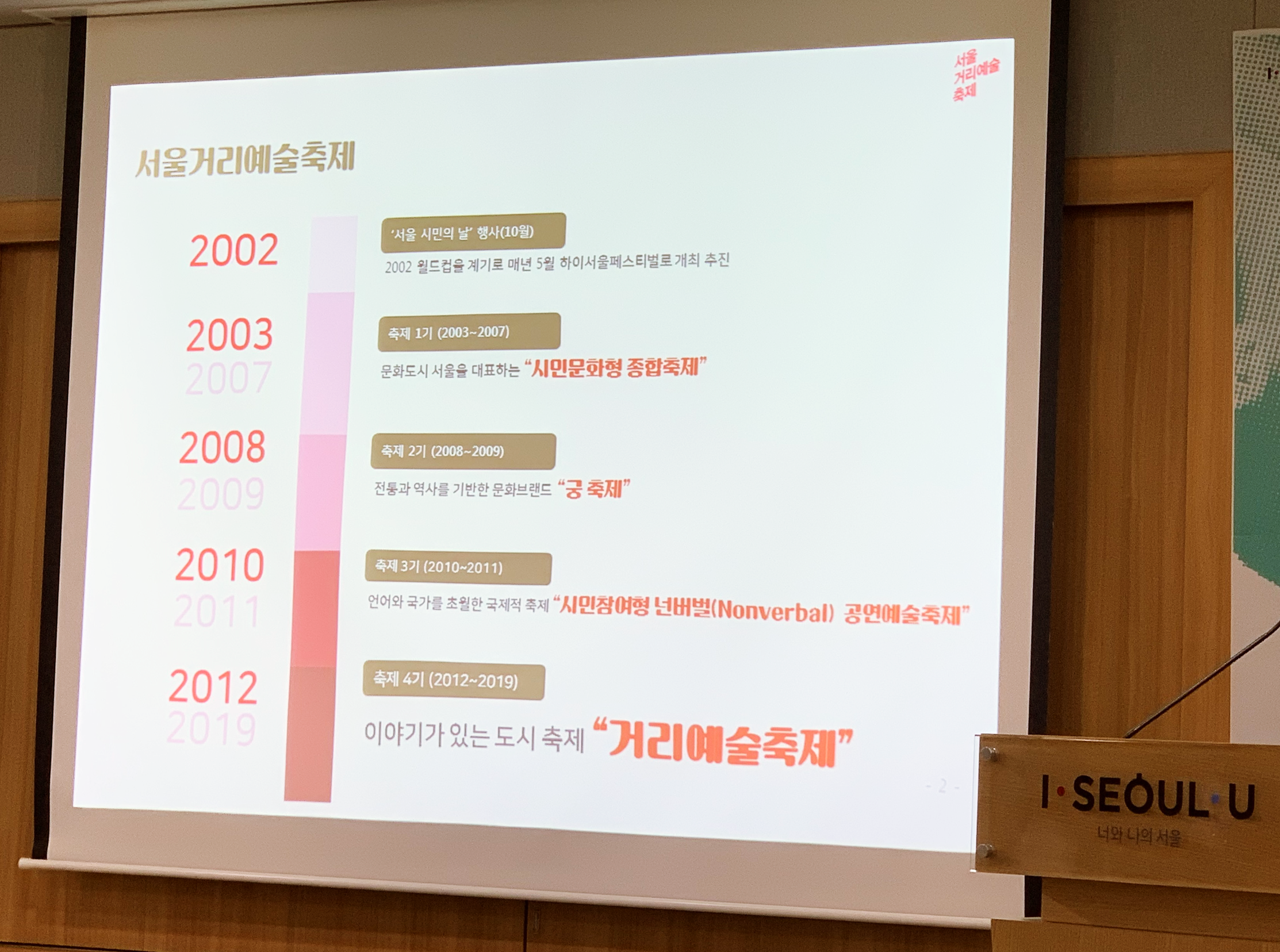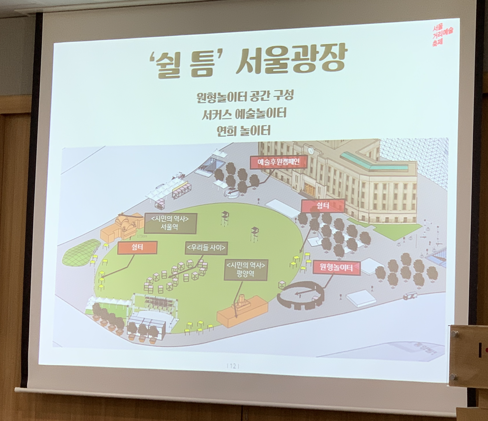 이 행사의 공동 감독인 중에 한 분인 윤종연 예술감독은 세부 프로그램을 소개했습니다. 서울거리예술축제는 2002년부터 개최되었으며 시민문화형 종합축제(2003~2007) 궁 축제(2008~2009) 시민참여형 넌버벌(Nonverbal) 공연예술축제(2010~2011)를 거쳐 2012년부터 거리예술축제 형태로 개최되었음을 알렸습니다.