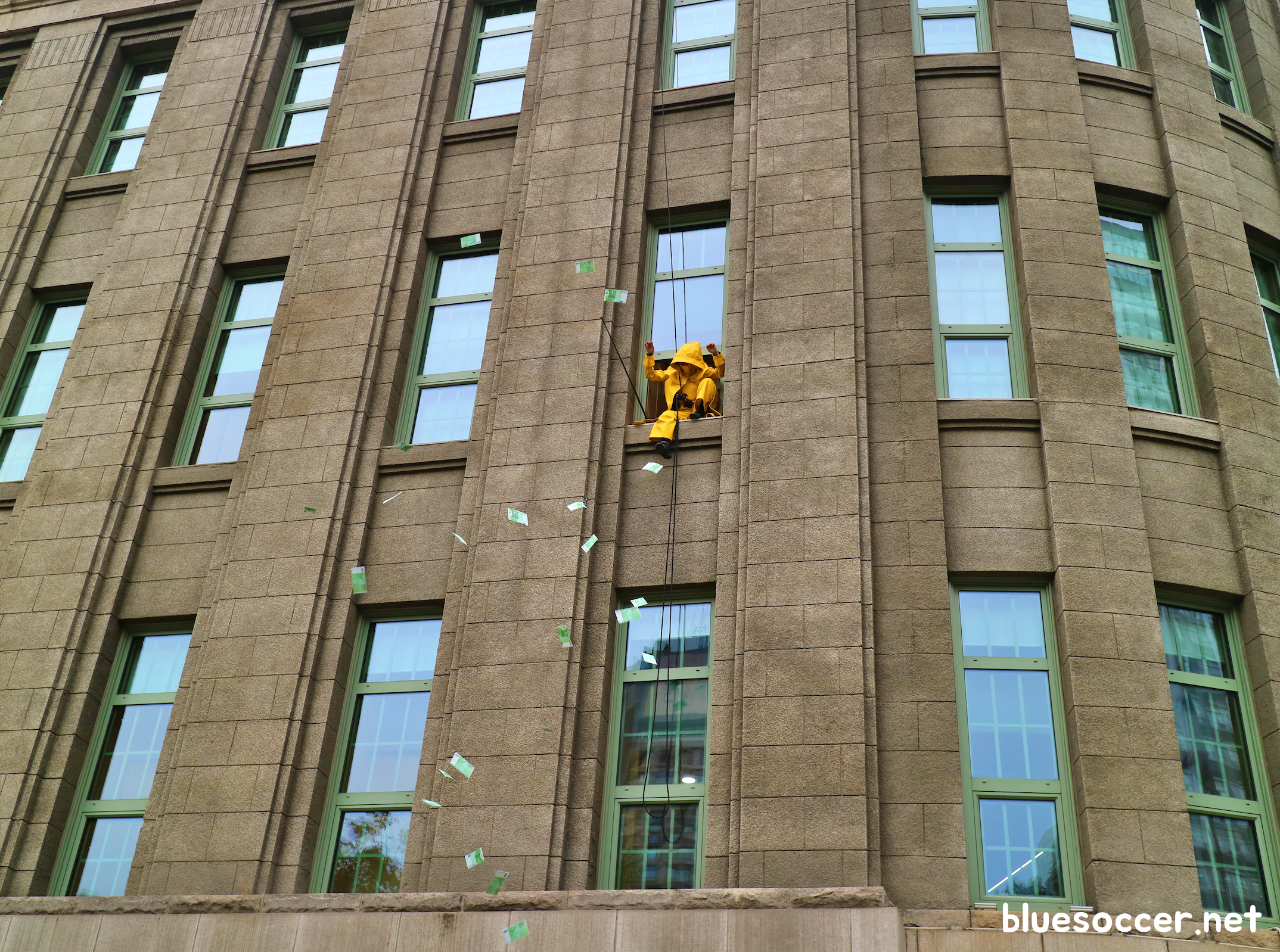 이번에는 서울광장에서 서울거리예술축제 2019 하이라이트 프레스콜 진행되는 모습을 봤습니다. 첫 번째 시연은 '#돈을무료로드립니다'(존 피셔맨, 스페인)가 맡았습니다. 처음에 서울도서관 옥상에 있다가 와이어 같은 것을 타고 밑으로 내려오는 모습이 마치 유격 훈련을 연상케 했습니다. 창문에서 돈을 흩날리는 퍼포먼스를 선보였는데 돈을 숭배하는 자본주의에 대한 일침을 가하는 내용이라고 합니다.