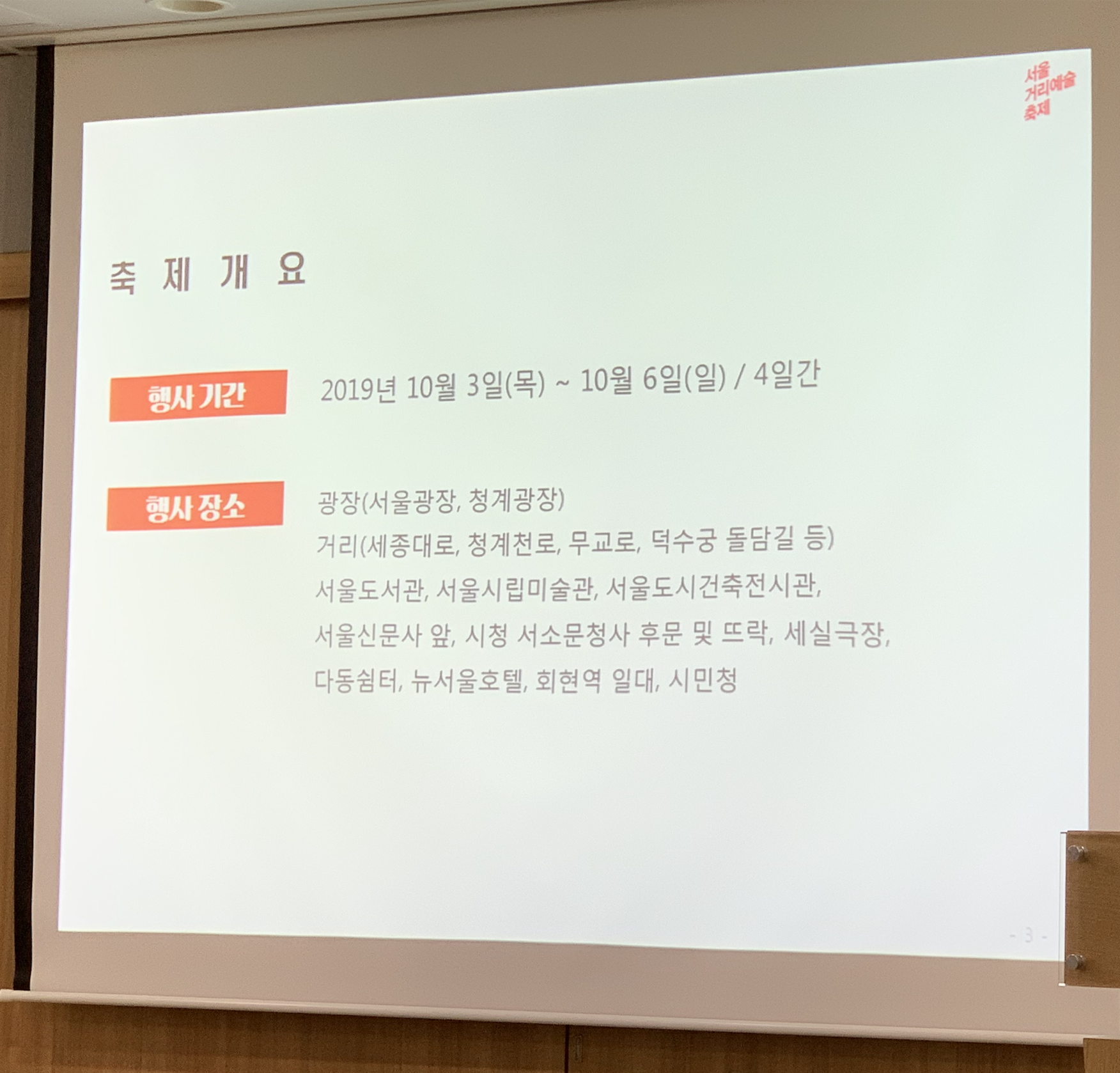 서울거리예술축제 2019 행사가 10월 3일부터 10월 6일까지 서울 도심 곳곳에서 총 183회 펼쳐질 예정입니다. 4일이라는 짧은 기간 동안 거리예술 공연이 서울의 주요 공간에서 진행된다는 점에서 눈길을 끕니다. 서울광장이나 청계광장 같은 서울에서 사람 많이 찾는 곳에서 말입니다. 행사기간 동안 서울 도심을 찾는 분들 중에는 서울거리예술축제 2019 공연하는 모습을 보는 사람이 있을지 모릅니다. 어떤 행사인지 기자간담회를 통해 접하게 됐습니다.