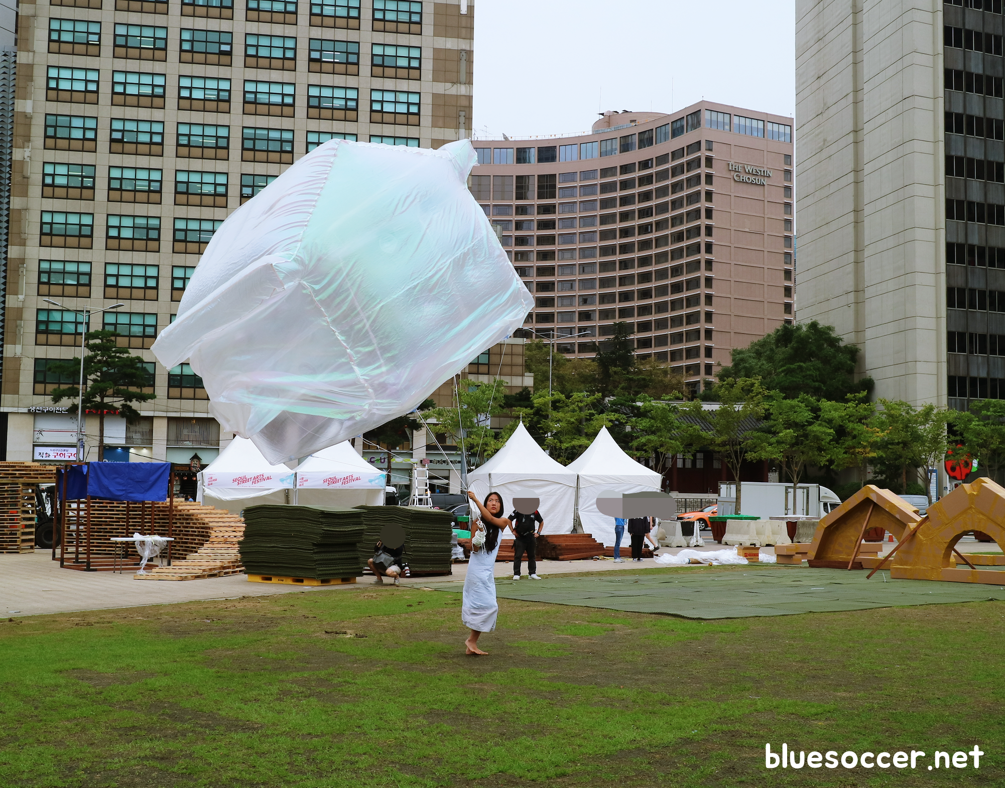 그 다음에는 '시민의 역사'(올리비에 그로스떼뜨, 프랑스)를 봤습니다. 해외작가와 시민들이 함께 종이상자와 테이프로 거대한 구조물을 짓는 과정을 볼 수 있습니다. 제가 갔을 때는 구조물 작업 진행이 초반 단계였는데 축제 기간 중에 얼마나 많이 올라갔을지 궁금하네요.