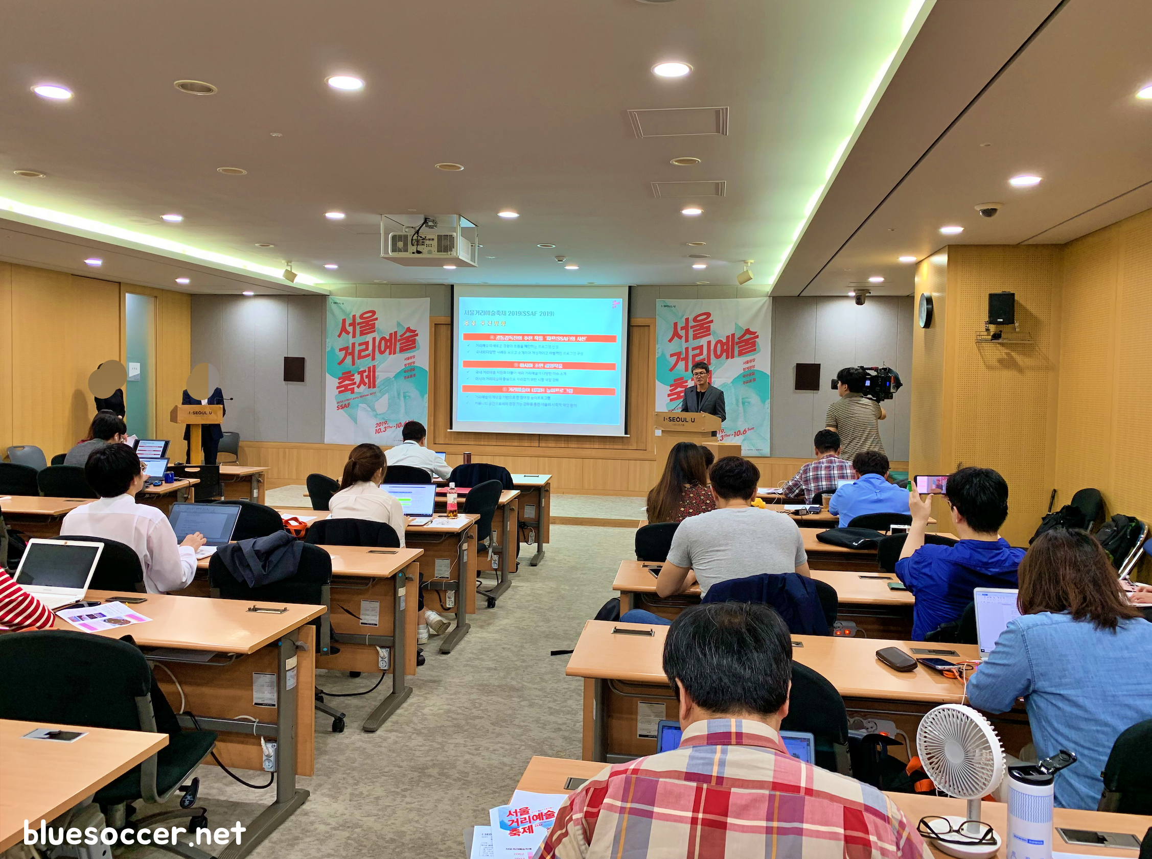 서울거리예술축제 2019는 행사 개막 하루 전이었던 10월 2일 서울시청에서 기자간담회를 개최했습니다. 기자들에게 행사를 알리는 시간을 가지는 것과 더불어 서울광장에서 펼쳐진 하이라이트 프레스콜을 통해 4팀의 공연이 시연된 모습을 볼 수 있었습니다. 시민들 앞에서 선보이는 공연 퍼포먼스가 어떻게 되는지 미리 접하게 됐습니다. 일종의 리허설 개념이라고 보시면 됩니다.