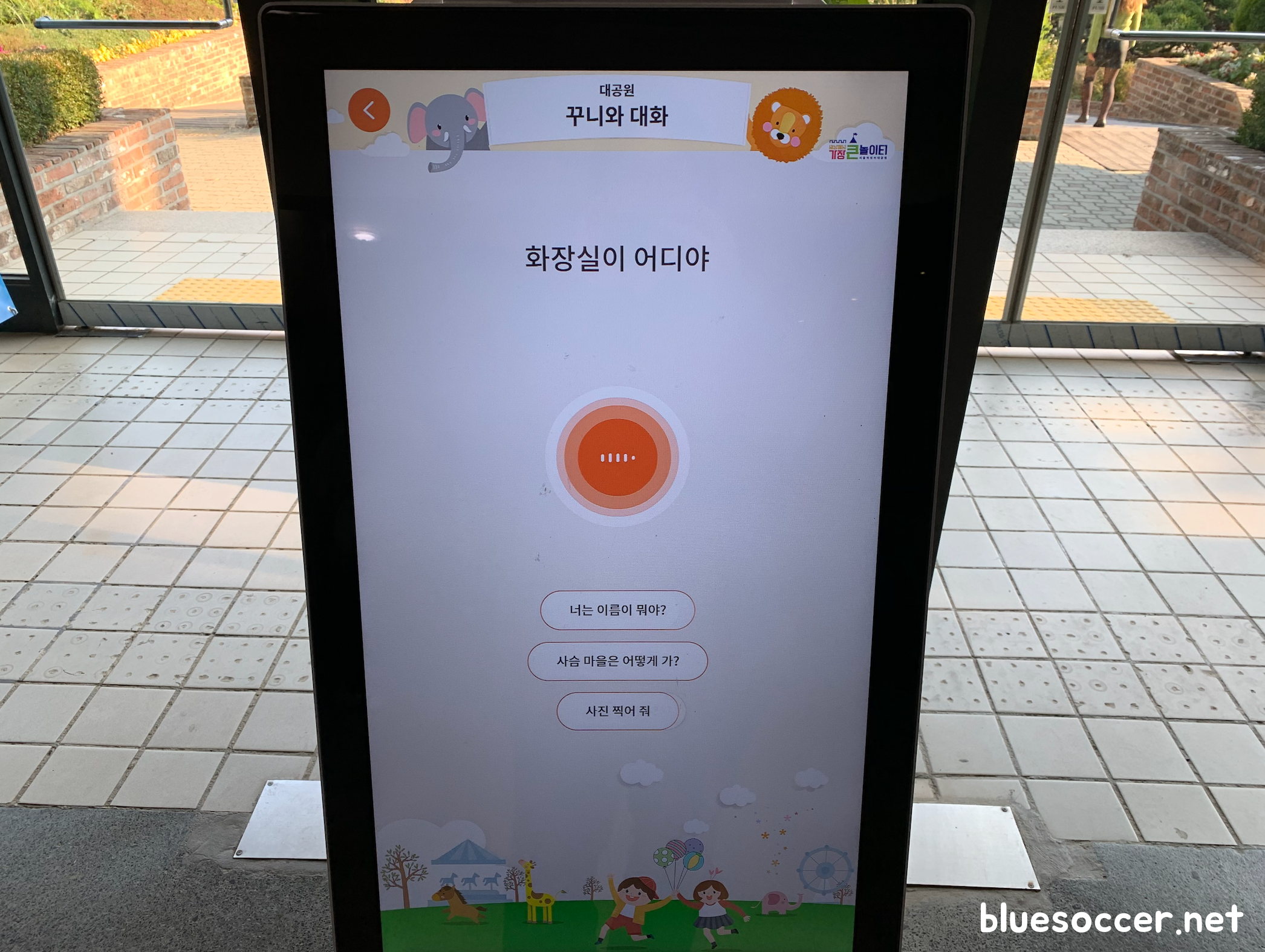 꾸니 모습은 이렇습니다. 인천국제공항 제1터미널에서 길 안내를 하는 로봇을 볼 수 있었는데 서울어린이대공원에서도 볼 수 있습니다. 다만, 꾸니 같은 경우에는 얼굴쪽에 사람의 모습과 비슷한 캐릭터가 있다는 점에서 친근한 느낌이 있습니다. 아마도 어린이들이 보다 쉽게 접근하도록 캐릭터를 설정한 것이 아닌가 싶습니다. 체감적으로는 이 친구가 인천국제공항에서 봤던 로봇보다 키(?)가 더 커보였습니다. 서로 같은 길 안내를 하는 역할이 설정되었으나 외형적인 모습은 전혀 달랐습니다.
