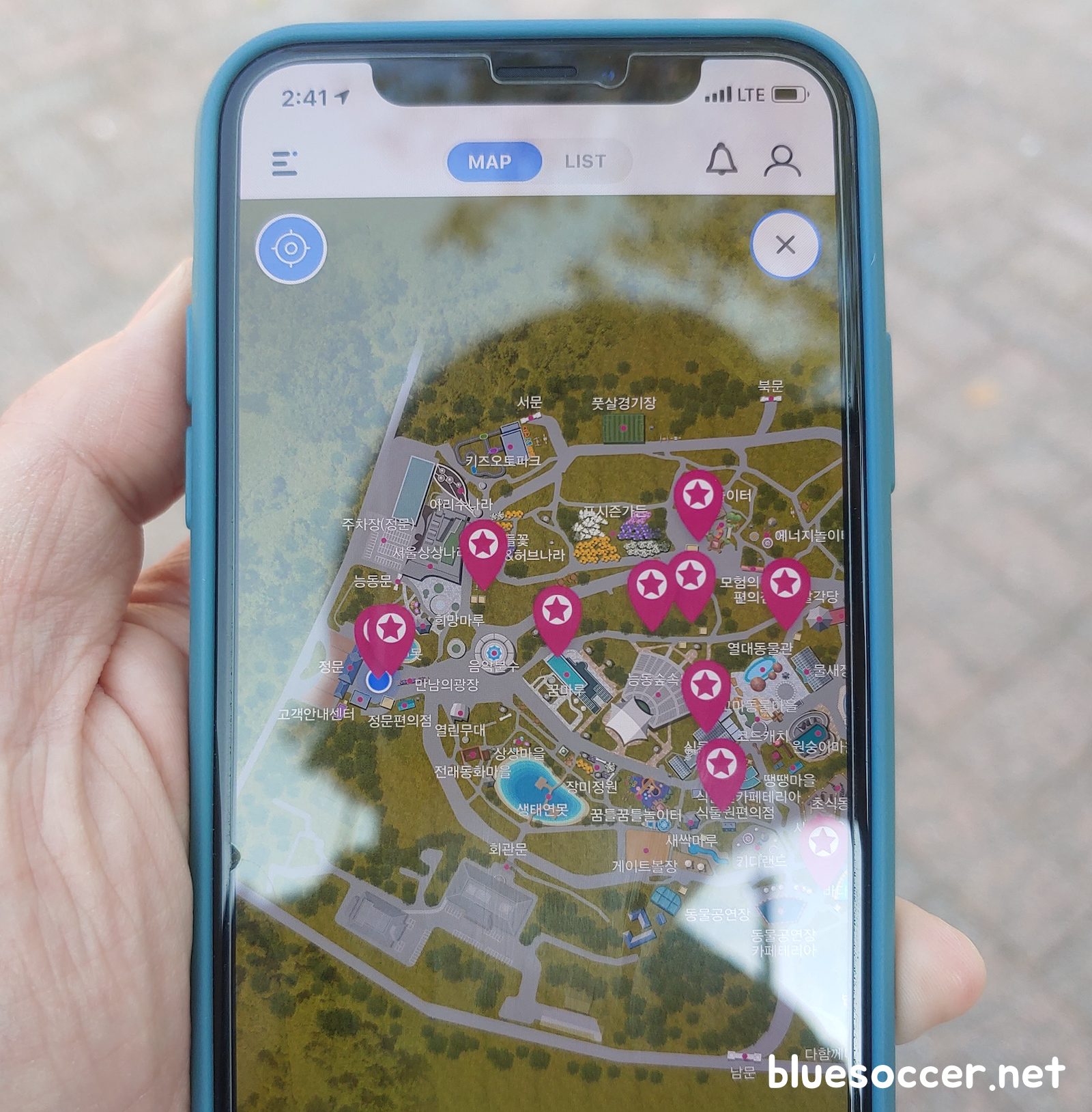 앱 상단 중앙에 있는 MAP은 그림으로 위치를 찾을 수 있습니다. 쉽게 표현하면 그림 지도가 될 것 같습니다. LIST는 특정 장소의 설명, 현재 위치와의 거리, 길찾기 기능이 있습니다. 만약 정문에서 식물원으로 이동할 경우 LIST에서 식물원을 찾은 뒤에 길찾기를 눌러서 이동 경로를 파악하면 됩니다.