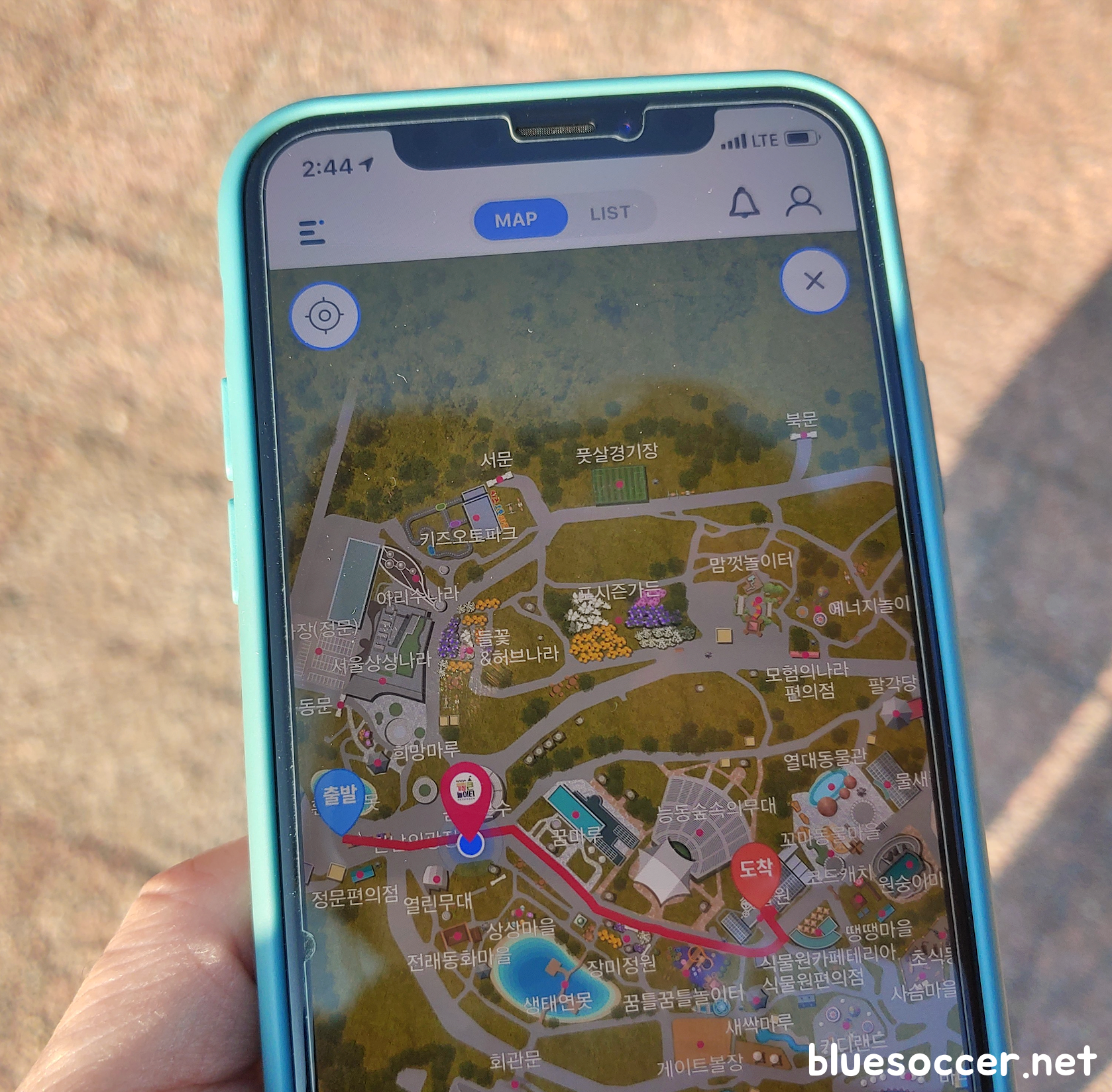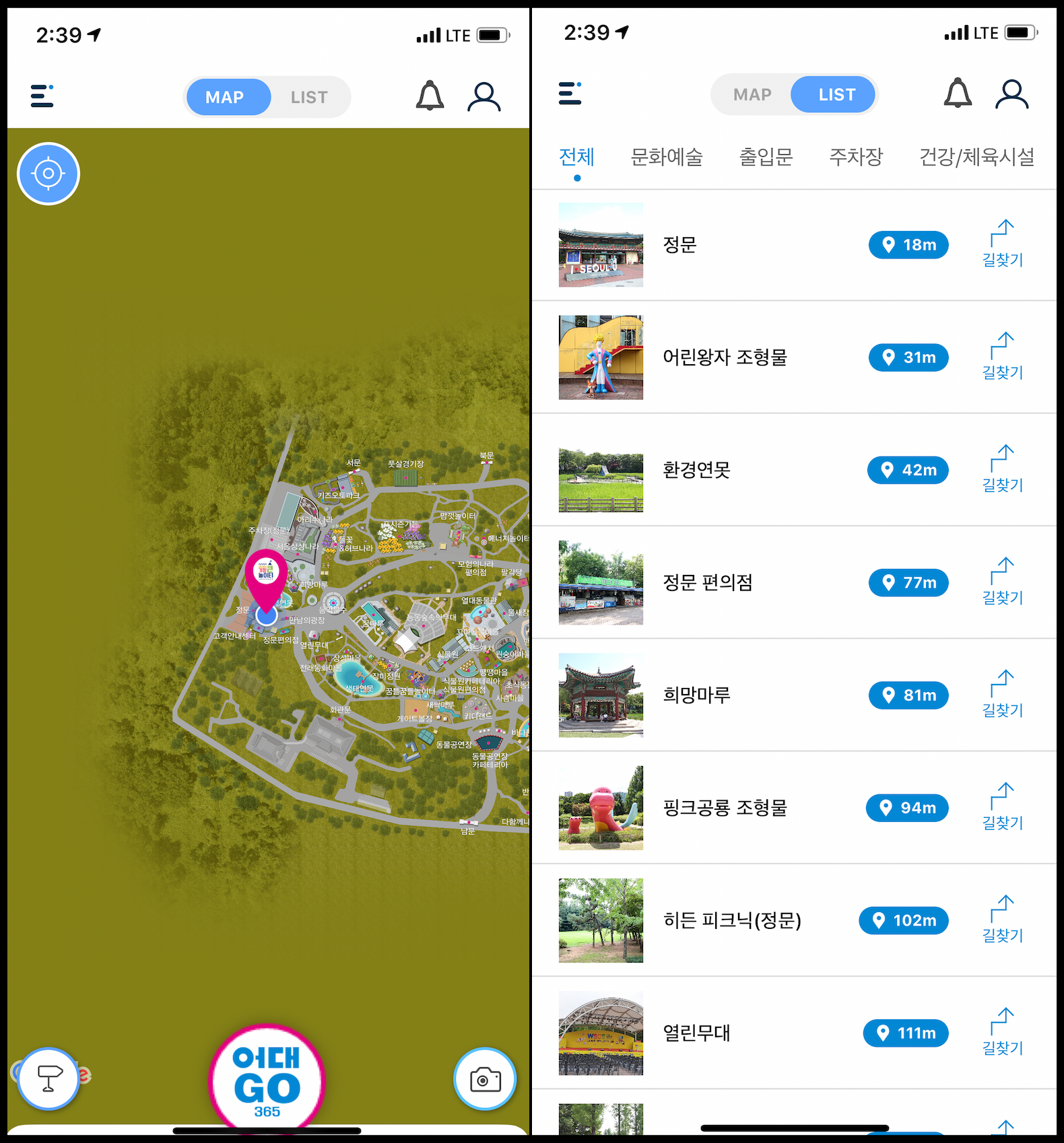 앱 상단 중앙에 있는 MAP은 그림으로 위치를 찾을 수 있습니다. 쉽게 표현하면 그림 지도가 될 것 같습니다. LIST는 특정 장소의 설명, 현재 위치와의 거리, 길찾기 기능이 있습니다. 만약 정문에서 식물원으로 이동할 경우 LIST에서 식물원을 찾은 뒤에 길찾기를 눌러서 이동 경로를 파악하면 됩니다.