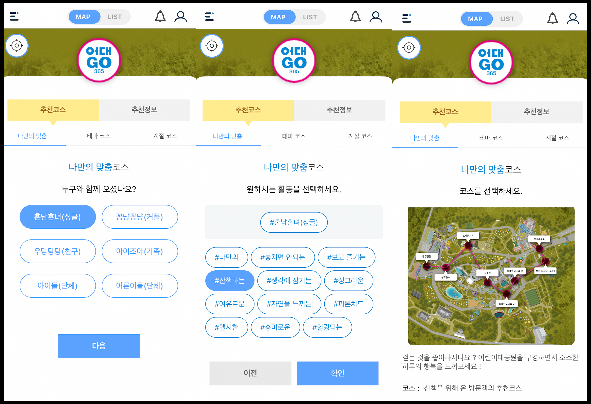 어대고365 앱 하단 토스트메뉴에서는 추천코스 및 추천정보가 안내됐습니다. 저 같은 경우 맞춤코스를 혼남혼녀(싱글)로 설정한 뒤 원하는 활동을 '#산책하는'으로 선택했습니다. 그러더니 환경연못, 포시즌가든, 식물원, 동물원 ZONE3, 동물원 ZONE2, 히든 피크닉(후문), 무지개분수로 이어지는 코스가 떴습니다. 저에게 잘 맞는 맞춤 코스가 어대고365에서 안내됐습니다. 워낙 서울어린이대공원 규모가 넓기 때문에 어디부터 돌아다녀야 할지 고민하는 분들에게 잘 맞는 앱 같았습니다.