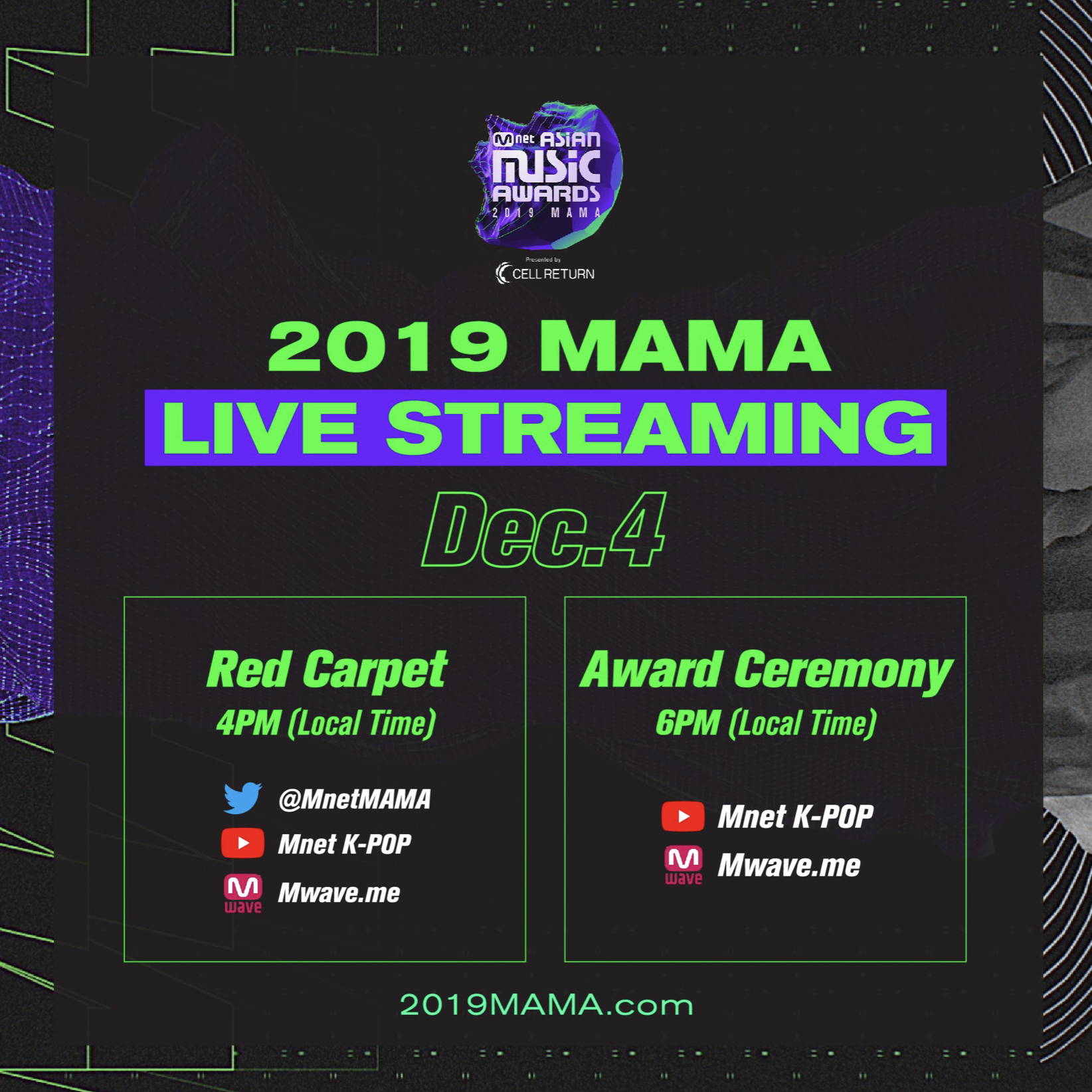 [사진 = 2019 마마 중계 Mnet에서 시청할 수 있습니다. 만약 온라인에서도 보고 싶다면 오후 4시부터 시작하는 레드카펫 행사는 MnetMAMA 트위터, Mnet K-POP 유튜브, Mwave.me에서 만날 수 있으며 오후 6시부터 시작하는 본행사는 Mnet K-POP 유튜브, Mwave.me에서 볼 수 있습니다. (C) 마마 공식 트위터]