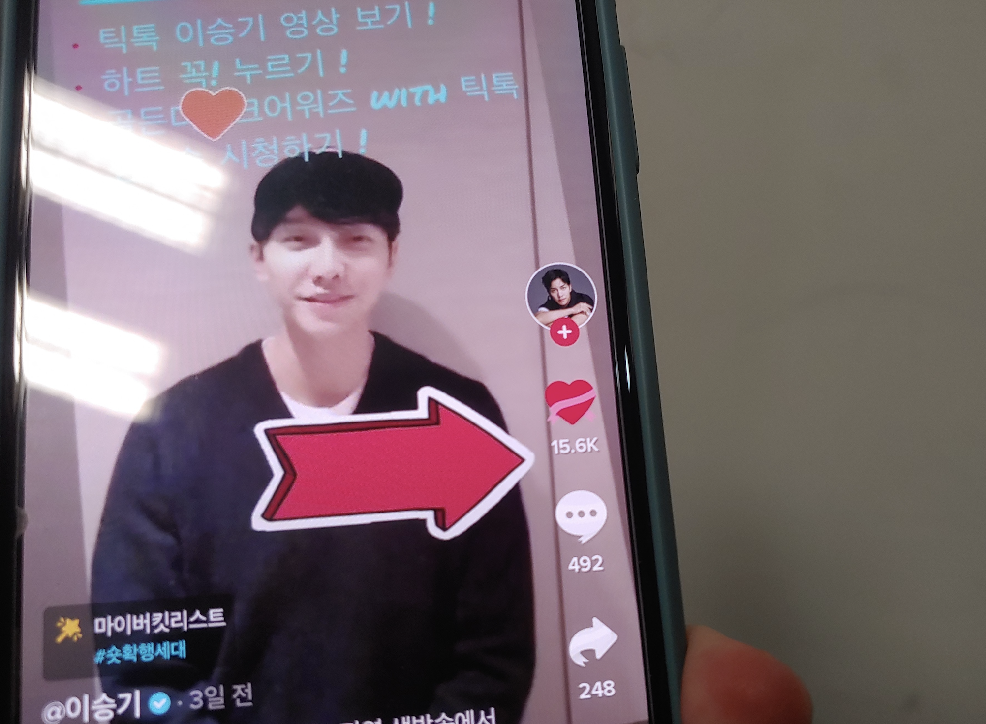 이승기 틱톡 영상에서도 좋아요 누르는 위치를 친절하게 안내하고 있군요. 화살표 기능이 재미있게 느껴집니다.