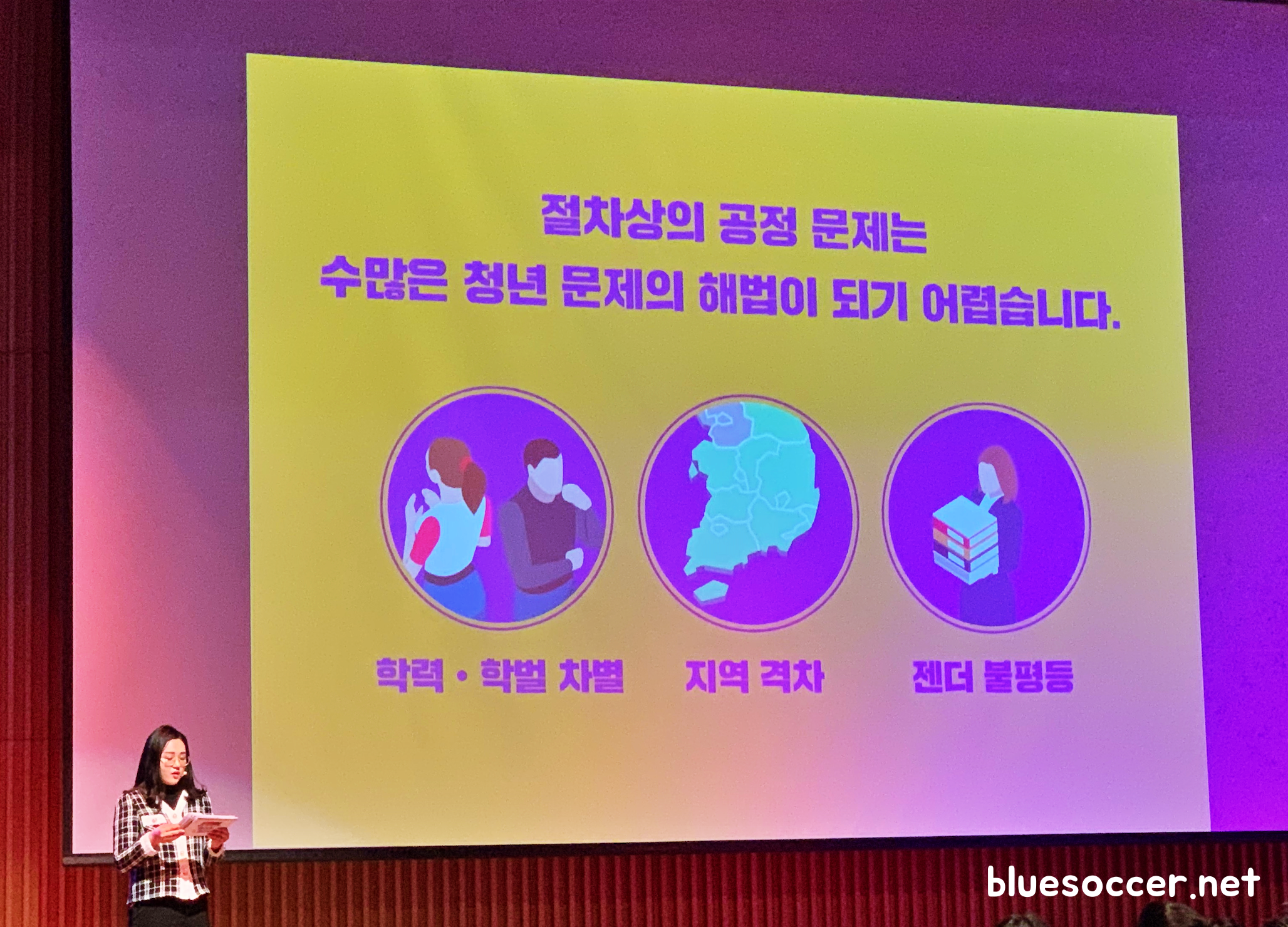 1부 출범식 사회를 맡았던 강석일씨는 불평등과 관련된 아이스브레이킹의 시간을 가졌습니다. 그중에 집이 있는 사람과 집에 세들어 사는 사람의 불평등, 자기계발서를 거론하는 모습을 보며 공감할 수 밖에 없더군요. 청년의 시점에서 사회적인 현실을 잘 짚어낸 것 같습니다. 확실히 청년 세대에서 사회의 불평등을 느끼는 사람이 많은 것 같네요. 저의 생각이지만, 집 같은 경우 서울에 있는 자기 집에서 대학교로 다니는 것과 지방에서 서울로 올라오면서 대학교 근처 비싼 월세를 알아보며 대학교 다니는 것은 차이가 크다고 봅니다. 전자보다는 후자가 돈을 많이 쓸 수 밖에 없으니까요.