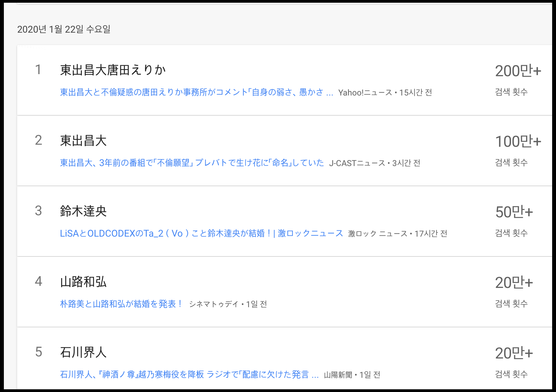 [사진 = 지난 1월 22일 구글 트렌드 일본 인기 검색어를 보니 히가시데 마사히로 관련 키워드가 1~2위를 기록했습니다. 1위 키워드 히가시데 마사히로 카라타 에리카(東出昌大唐田えりか) 키워드는 200만 회 이상 검색됐습니다. 일본에서 상당한 검색량을 나타낸 것으로 확인됐습니다. (C) 구글 트렌드]