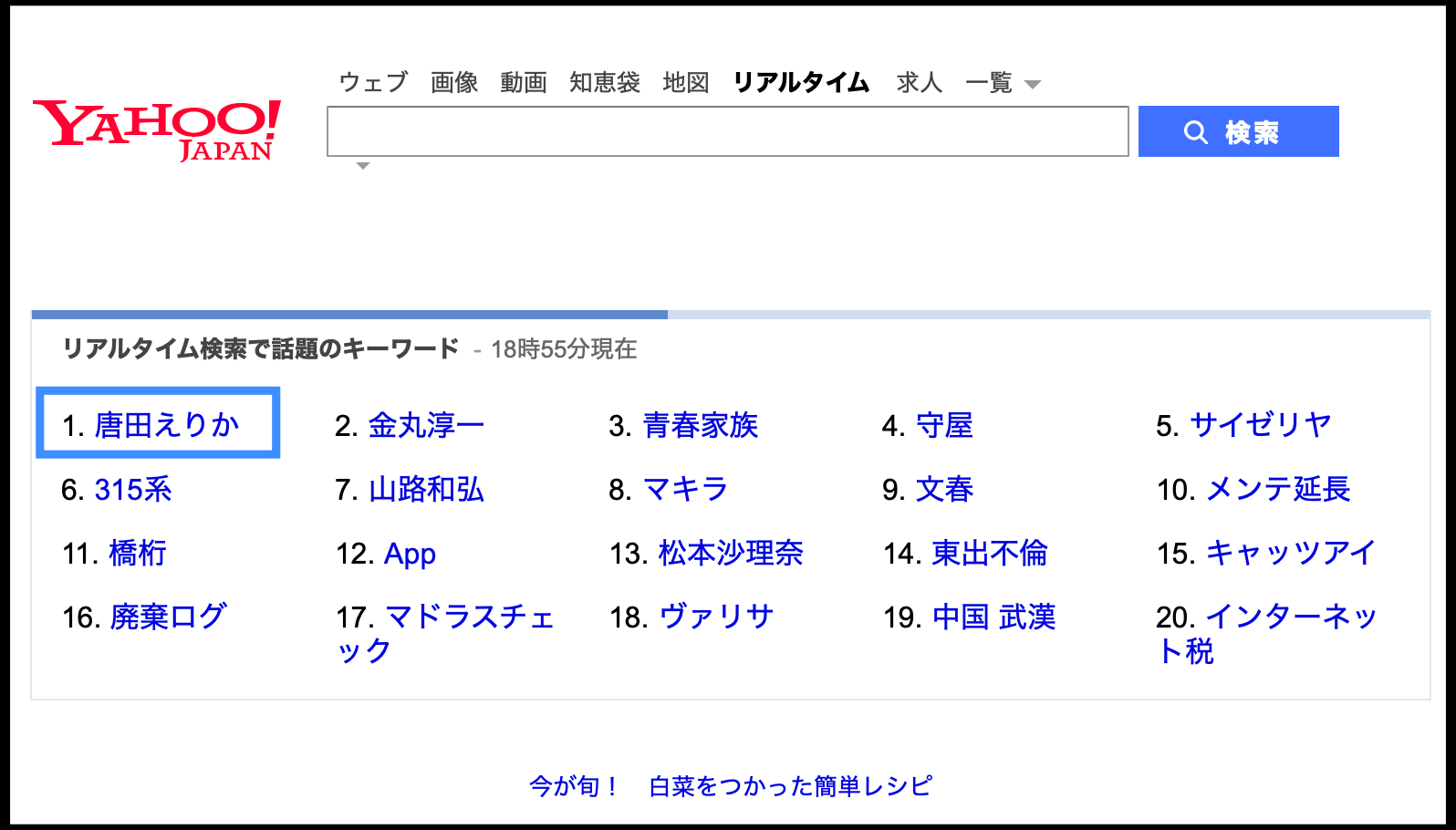 [사진 = 카라타 에리카는 지난 1월 22일 야후재팬 실시간 검색어 1위에 올랐습니다. 주간문춘 보도 이후로 그의 이름을 알게 된 일본인들이 많았을 것으로 짐작됩니다. 카라타 에리카 나이 일본 기준으로 22세(1997년 9월 19일생)라는 점에서 이번 이슈는 타격이 클 것으로 보입니다. 과연 일본에서 정상적인 연예계 활동을 할지, 한국 연예계 활동을 병행할지 알 수 없는 상황입니다. (C) 야후재팬 공식 홈페이지(yahoo.co.jp)]