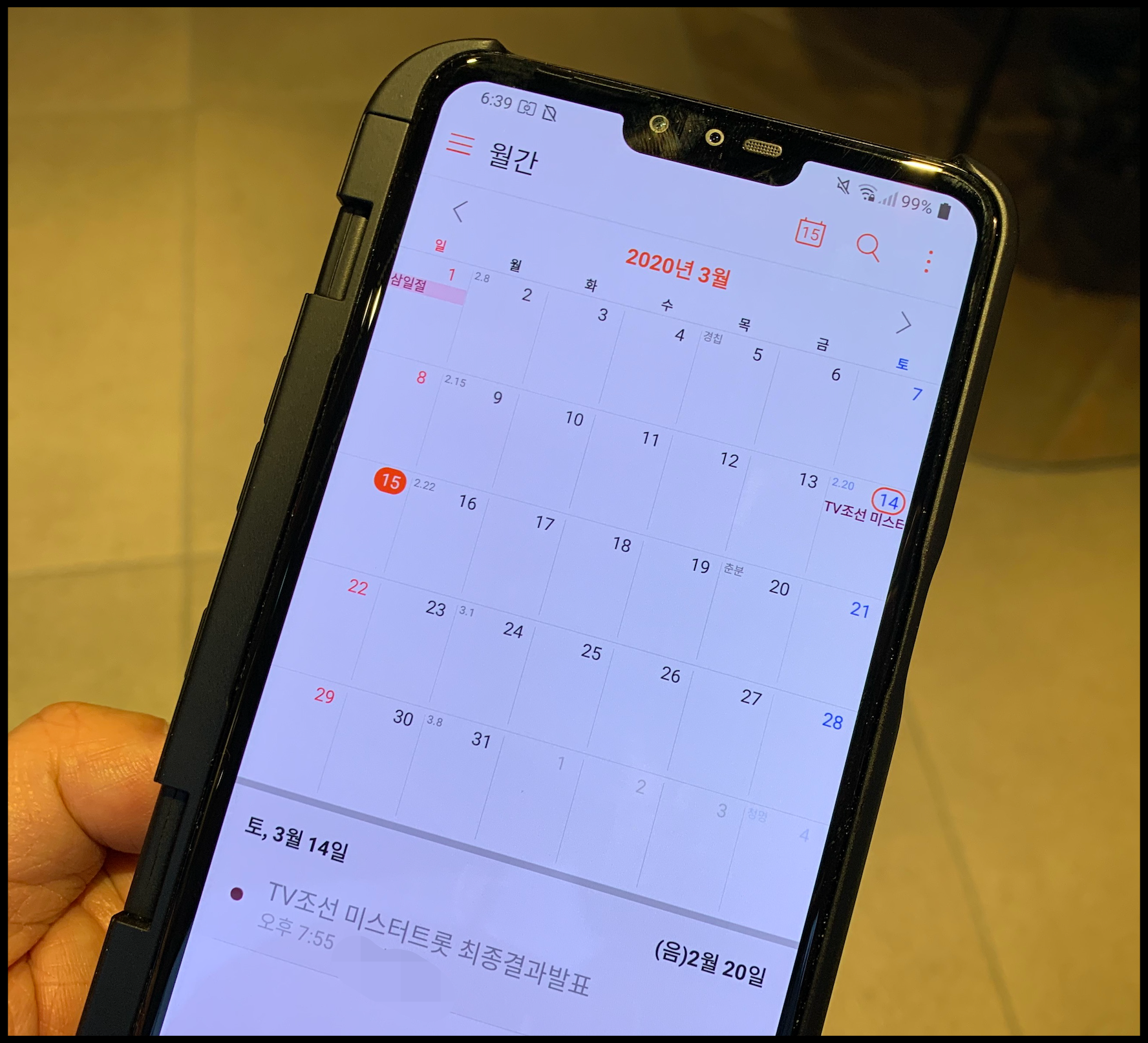 [사진 = 2020년 3월 14일 TV조선 미스터트롯 최종결과발표가 방영됐습니다. 사진은 저의 스마트폰 달력이며 2020년 3월 14일을 가리킵니다. (C) 나이스블루]