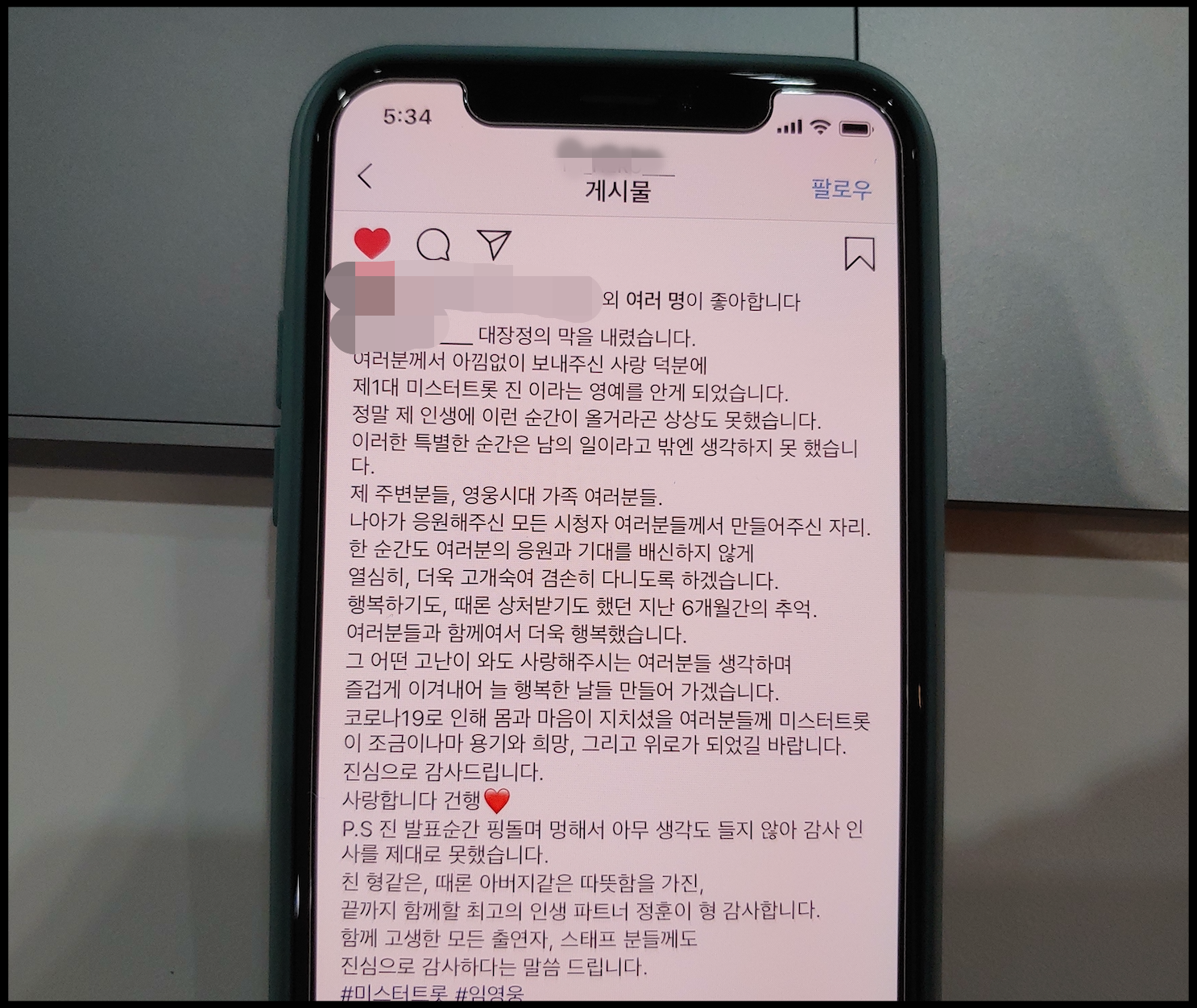 [사진 = 임영웅은 지난 3월 15일 인스타그램을 통해 미스터트롯 진 수상 소감을 전했습니다. 소감을 읽어보니 그동안 자신을 성원했던 팬들에 대한 감사의 메시지였습니다. 이런 순간이 올거랄곤 상상도 못했다며 그동안의 추억이 여러분들과 함께라서 행복했다고 밝혔습니다. 코로나19로 인하여 몸과 마음이 지쳤을 분들에게 미스터트롯이 조금이나마 용기, 희망, 위로가 되었길 바란다는 내용도 있습니다. (C) 임영웅 인스타그램]
