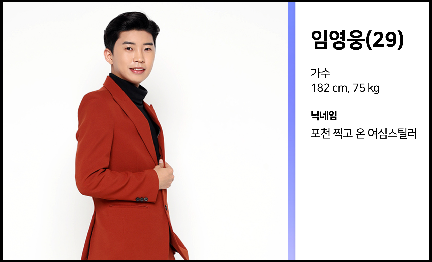 [사진 = TV조선 미스터트롯 임영웅 프로필 사진을 보면 왼쪽 뺨을 가리면서 촬영했음을 알 수 있습니다. 임영웅 얼굴흉터 보이지 않기 위해 이러한 모습으로 촬영했던 것 같습니다. 얼굴에 상처가 있는 이유는 어렸을 적에 유리병이 왼쪽 뺨에 찍혔고 무려 30바늘이나 꿰맸다고 합니다. 훗날 임영웅 얼굴흉터 제거수술 알아봤던 것으로 알려졌으나 자칫 안면 신경을 건드릴 수 있기 때문에 임영웅 흉터 수술 진행되지 않았습니다. 미스터트롯을 통해서 임영웅 얼굴흉터 모습이 전국의 수많은 시청자들에게 공개됐습니다. (C) TV조선 미스터트롯 공식 홈페이지 프로필 사진]