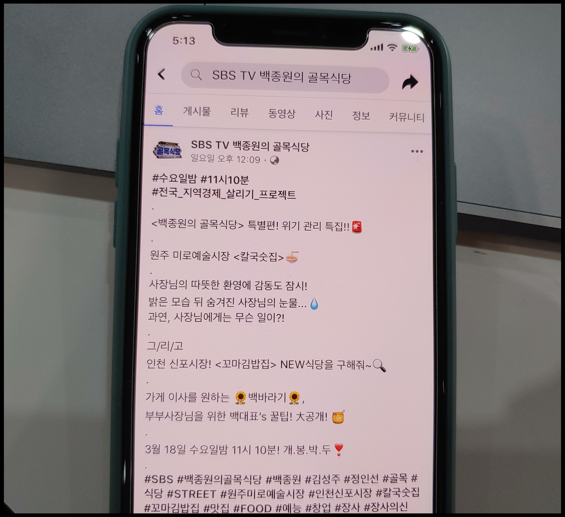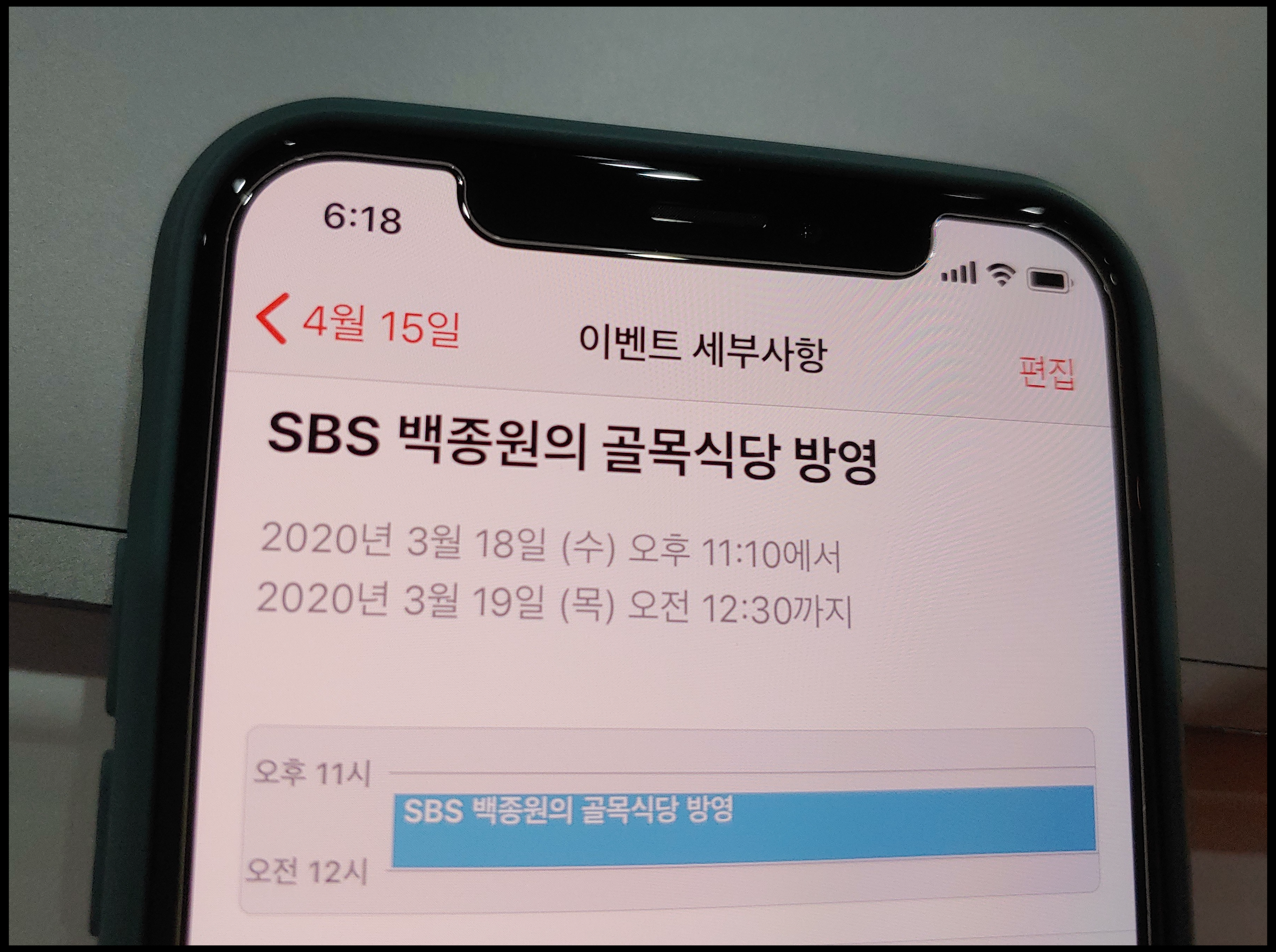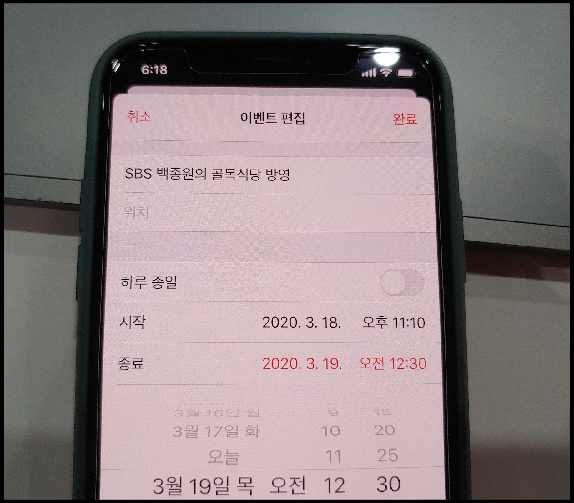 [사진 = 2020년 3월 18일 SBS 백종원의 골목식당 방영됩니다. 사진은 저의 스마트폰 달력이며 2020년 3월 18일을 가리킵니다. (C) 나이스블루]