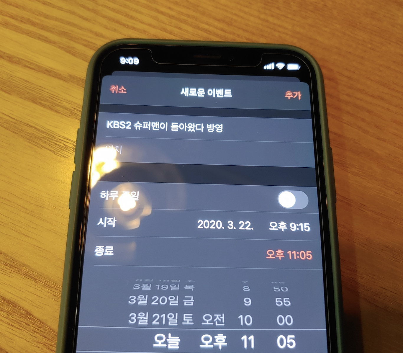 [사진 = 2020년 3월 22일 KBS2 슈퍼맨이 돌아왔다 방영 예정이다. 사진은 글쓴이 스마트폰 달력이며 2020년 3월 22일을 가리킨다. (C) 나이스블루]