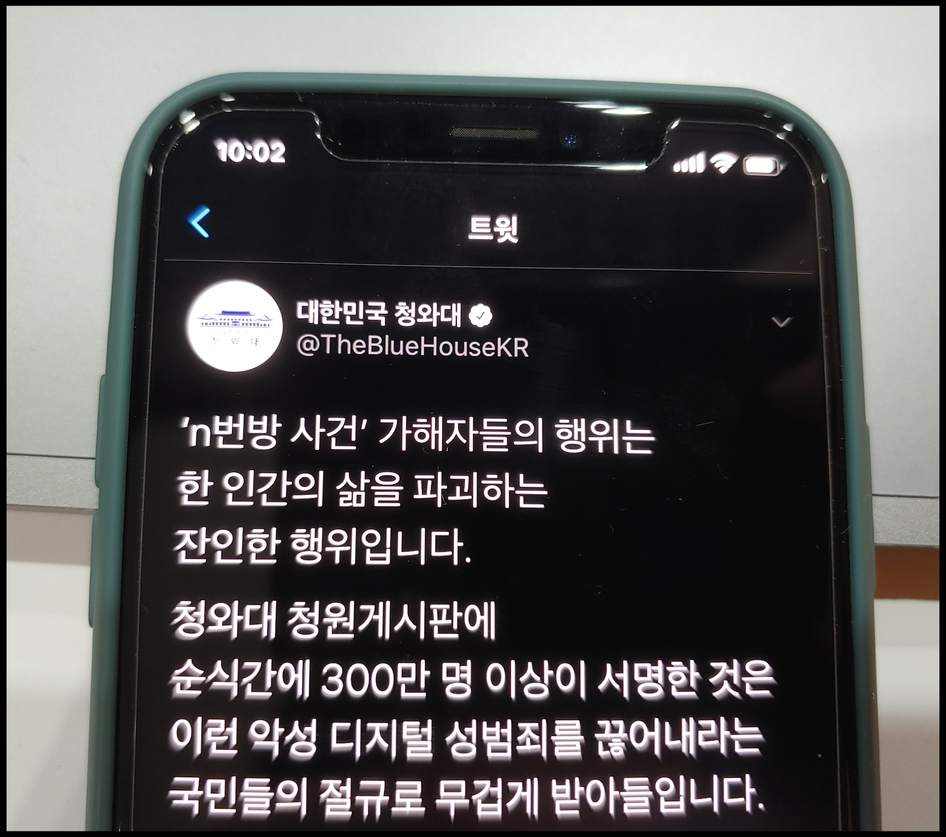 [사진 = 대한민국 청와대 공식 트위터에서는 N번방 사건 가해자들의 행위가 한 인간의 삶을 파괴하는 잔인한 행위라고 언급했습니다. (C) 대한민국 청와대 공식 트위터]