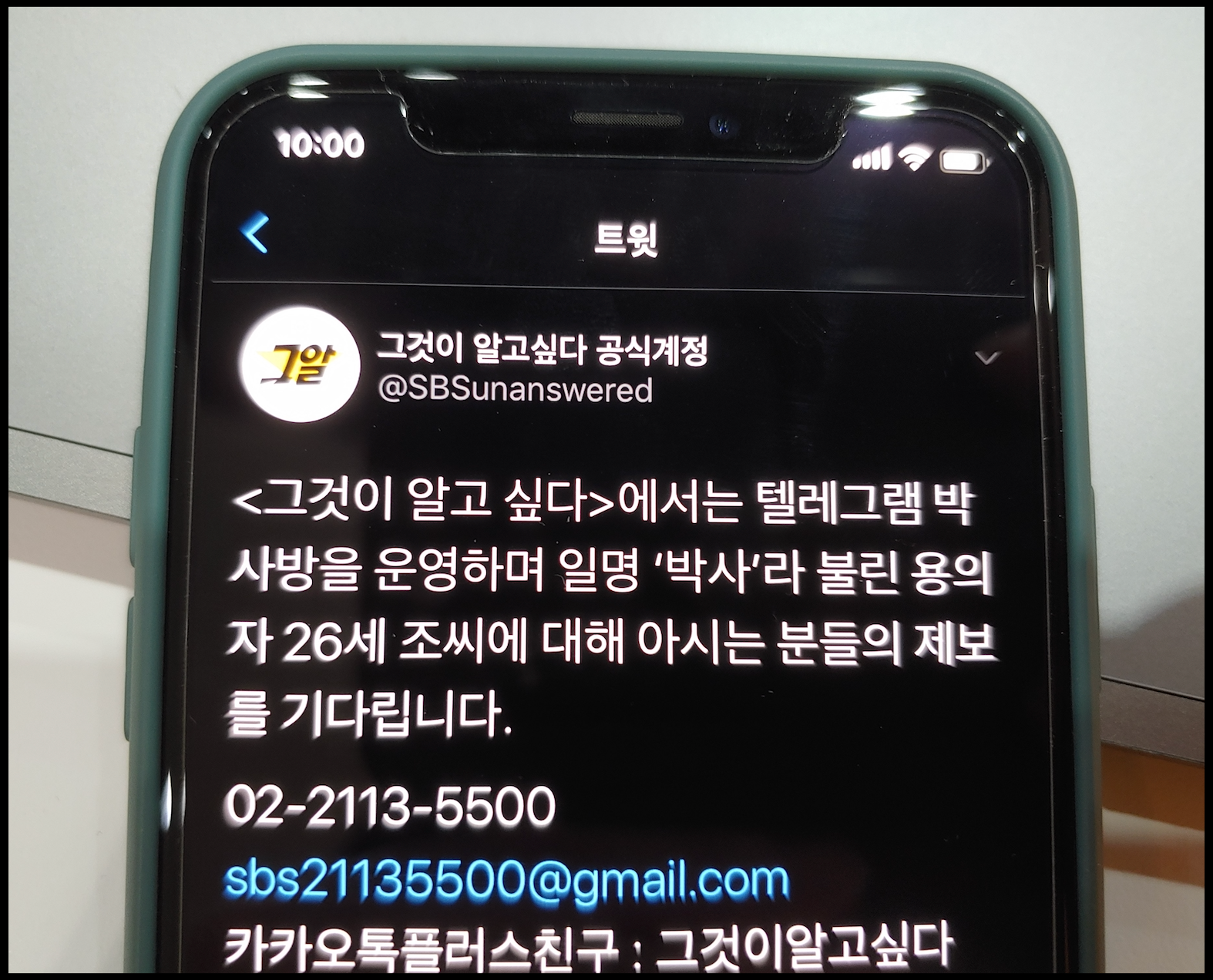 [사진 = SBS 그것이 알고싶다 공식 트위터에서는 텔레그램 박사방 운영자였던 용의자 26세 조씨에 대한 게시물을 올렸습니다. 그 조씨의 이름은 SBS 8뉴스를 통해 조주빈으로 밝혀졌습니다. 오는 3월 28일 SBS 그것이 알고싶다 조주빈 방영 앞두고 있습니다. 그가 운영했던 박사방, 그 이전에 존재했던 N번방에 대한 상세한 보도를 접할 수 있을 것입니다. (C) SBS 그것이 알고싶다 공식 트위터]