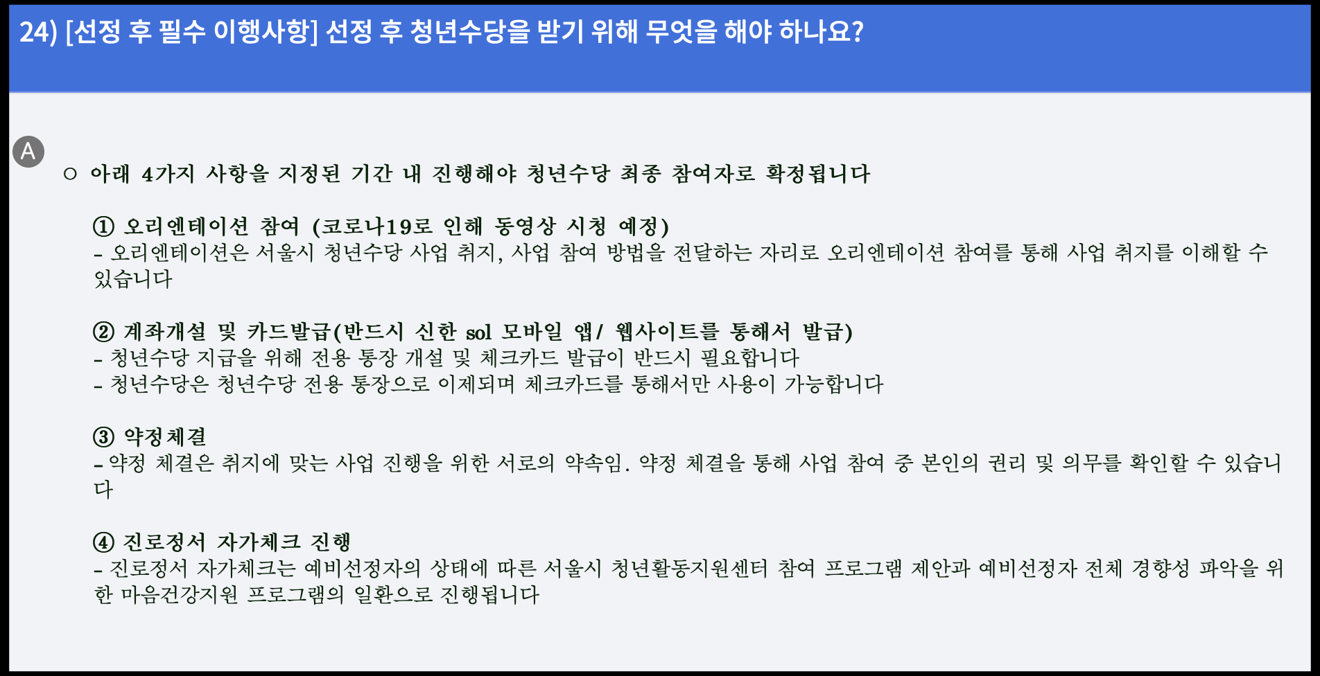 그와 더불어 동일기간 동안 정부 사업과 중복참여 할 수 없습니다. 여기서 말하는 정부 사업(고용노동부 관련)은 앞서 언급했던 취업성공패키지, 실업급여(구직급여) 뿐만 아니라 청년구직활동지원금, 청년내일채움공제(취업자가 가입) 내일배움카드(훈련장려금)를 말합니다. 다만, 서울시 청년수당 신청일 이전 관련 사업참여 종료된 사람은 신청 가능하며 예전에 내일배움카드만 발급해서 가지고 있다면 가능합니다.