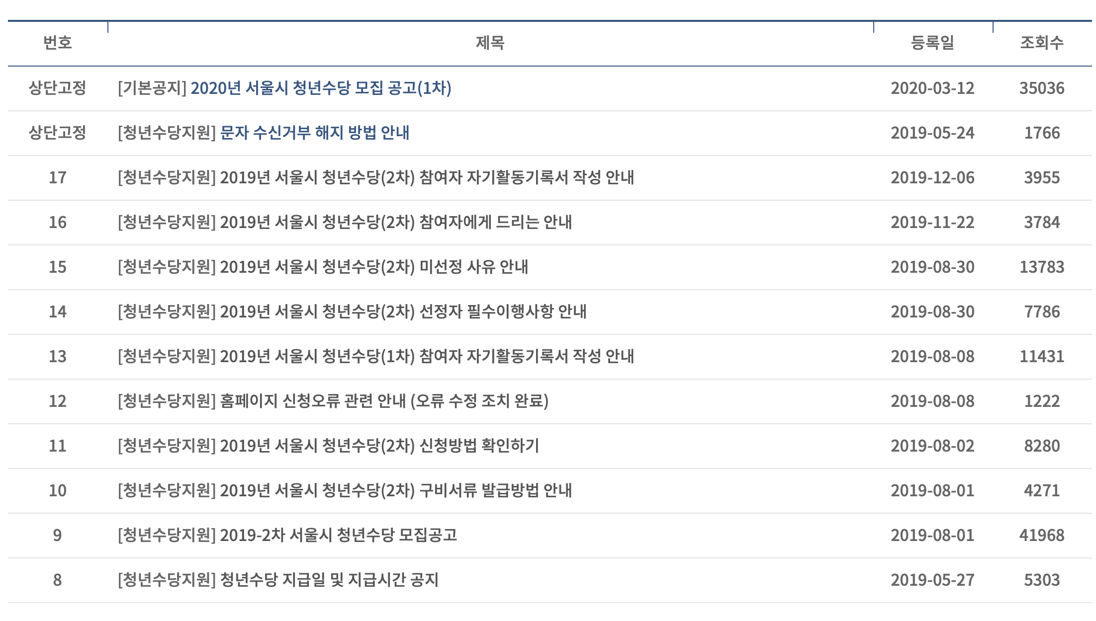 서울청년포털 홈페이지의 청년수당 공지 메뉴를 보니 눈에 띄는 점을 볼 수 있었습니다. 서울시 청년수당 모집 공고 게시물이 다른 게시물들에 비해서 조회 수가 높다는 점, 그 조회 수가 3~4만 뷰 단위라는 점입니다. 2020 서울시 청년수당 모집 공고(1차)의 경우 조회 수가 3만 5천 뷰 넘었습니다. 아직 모집 시작하지 않았는데 벌써부터 공고에 관심을 갖는 사람이 많습니다. 이는 2020 서울시 청년수당 혜택 받고 싶어하는 서울의 청년이 얼마나 많은지 알 수 있습니다. 이제 이 정책에 대해서 안내를 해볼까 합니다.